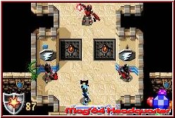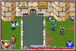 In Sachen Steuerung ist diese bei allen Rittern gleich gehalten. Unterschiede sind eher im Detail ihrer Fähigkeiten zu finden. Während Ihr lauft ist die A-Taste die wichtigste Aktionstaste im gesamten Spiel. Damit führt Ihr einen Nahangriff aus, in dem Ihr so euer Schwert schwingt und könnt per gedrückt halten eine Fernattacke zünden. Diese Fernattacken beherrschen alle Ritter und müssen durch das finden bestimmter Kristalle aktiviert werden. Einmal gefunden stehen sie allen zur Verfügung. Rechts unten im Screen tauchen diese auf und werden per B-Taste durchgeschalten. Sinn dieser 4 Kristalle sind unterschiedlich starke Fernattacken, die bei bestimmten Gegnern auch verschiedene Wirkung haben. Damit Ihr diese nicht unentwegt benutzen könnt ist dem ganzen ein Riegel vorgeschoben. Unten in der Mitte des Screens findet man eine Füllanzeige in Form eines Schwertes. Hält man die A-Taste gedrückt läd sich das Schwert auf, ein wenig Energie verschwindet aus der Leiste und Ihr feuert beim loslassen einen Energiestrahl auf Gegner oder Objekte wie Schalter die man so umlegt.