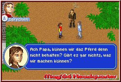 Am Hof selbst könnt Ihr Euch mit Menschen unterhalten, die kleinere Aufgaben von Euch fordern. So sollt Ihr einen Ausritt wagen oder das Pferd vollständig versorgen. Eine kleine Anzeige stellt den nächsten notwendigen Gegenstand dar, der zum Lösen der nächsten Aufgabe vonnöten ist. Das eigentliche Hauptaugenmerk liegt in "Pferd & Pony - Lass uns reiten 2" - dem Namen nach - im Reiten. Habt Ihr Euer Pferd gesattelt, ist es parat für einen kleinen Ritt. Die Steuerung hier erweist sich als ziemlich gewöhnungsbedürftig und wenig intuitiv. Neben dem Schritt beherrscht das Pferd den Trab, sowie den Galopp. In beiden Letzteren ist es sogar möglich über etwaige Hindernisse hinweg zu springen. Jedoch gestaltet sich dieses Vorhaben ähnlich unpräzise wie die restliche Steuerung des Spieles.