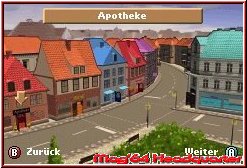 Gleich zu Beginn bekommt Ihr als junge Tierärztin die Aufgabe der Stadt einen Besuch abzustatten. Immerhin will ein eventueller Ansturm seitens tierischer Patienten samt "Herrchen" medikamententechnisch gut abgedeckt sein. In der Apotheke versorgt Ihr Euch - dank des geringen Startkapitals - mit Salben aller Art, erwerbt hilfreiche Mittel gegen Parasiten oder besorgt geeignete Impfstoffe, um anstehende Krankheiten erst gar nicht Wirklichkeit werden zu lassen. Schmerzmittel, Aufbaupräparate, Desinfektionslösungen, sowie Antibiotika sorgen für einen reich gefüllten Medikamentenschrank. Anfängliche Geldnöte könnt Ihr durch einen Besuch bei der Bank schnell vergessen machen. Bis zu 3.000 Euro verleiht das Geldinstitut - zinslos versteht sich. Lediglich soll das Geld peu à peu zurückgezahlt werden. Ein Futterhändler bietet ein reichhaltiges Sortiment verschiedenster Sorten an, die sich qualitativ unterscheiden. Meerschweinchen-, Wellensittich-, Kaninchen-, Pferde-, Katzen- und Hundefutter in drei unterschiedlichen Angebotsvarianten ("Normal", "Gut", "Spezial") erfreuen den Gaumen der tierischen Patienten. Eine Übersichtskarte klärt Euch darüber auf, ob Futternachschub notwendig ist. Weiterhin findet Ihr in der Stadt ein Werbebüro, in welchem Ihr Anzeigen in Flyer-Form, in Zielgruppen-Zeitschriften oder gar im Fernsehen schaltet. Notwendig wird das im Laufe des Spieles allemal, da das Spielvergnügen anderenfalls arg in die Länge gezogen wird. Eine Werbeschaltung hingegen löst das Problem mangelnder Patientenzahlen. Da Ihr Euch nicht auf Kleinsttiere wie Meerschweinchen und Wellensittiche versteifen mögt, warten in der Akademie vier Lehrgänge auf Euch. Entscheidet Ihr Euch beispielsweise für Hundemedizin, bekommt Ihr einige Fakten zu Hunden vorgesetzt, die Ihr Euch merken solltet. In einem einfachen Frage/Antwort-Spiel beantwortet Ihr die an Euch gerichteten Aufgaben und habt bereits nach kurzer Zeit die Erlaubnis, ab sofort auch Hunde in Eurer Praxis behandeln zu dürfen. Daneben erwarten Euch noch Lehrgänge in der Katzen- und Pferdemedizin, sowie der Pferdetherapie.