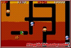Schon mal etwas von "Boulder Dash" gehört? Ähnlich präsentiert sich "Dig Dug" auf dem GBA-Modul. Im Dienste des "Erdloch-Schaufelns" buddelt Ihr Euch in die Tiefe, weicht herumlungernden feindlichen Kreaturen aus, lasst Felsbrocken unverfroren auf Eure Widersacher fallen und bekämpft sie mit Eurer Pumpe! Richtig gehört: Pumpe! Eure Kontrahenten werden nämlich nicht mit einer üblichen Waffe besiegt, sonder verspüren ein überaus druckvolles Lüftchen in ihrem Inneren - bis die Pumpe sie zum Platzen bringt! Klingt zwar einfach, jedoch benötigt jeder Feind einige Luftstöße bis zur feierlichen Explosion. Wie in allen Arcade-"Hits" ist das aktuelle Leben bereits nach einer gegnerischen Berührung beendet. Extraleben vereinfachen Euch das Spiel zwar etwas, der Schwierigkeitsgrad ist dennoch gesalzen und nichts für Weicheier.