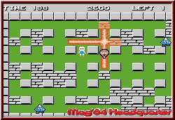 Anfangs steht euch dazu einzig eine einzige Attacke zur Verfügung. Wie nicht anders erwartet legt Ihr als Spieler Bomben und müßt damit die Gegner erwischen. Zu Beginn könnt Ihr gerade mal eine Bombe legen, die auch nur je einen Bereich in den 4 bekannten Richtungen um sich herum zerbröselt. Neben Gegnern könnt Ihr so auch Steine in den Stages zerstören, die zum einen das Tor irgendwo verstecken oder diverse Upgrades, die schon immer das Salz in der Suppe waren. Erst mit den Upgrades wird das anfangs recht träge Gameplay besser. Ihr könnt so schneller laufen, mehrere Bomben legen und deren Trefferradius erhöhen. Schön das diese Dinge auch Stageübergreifend mitgenommen werden. Damit Ihr nicht einfach nur umherlauft und Bomben legt hat man den Gegnern einen Hauch von KI verpaßt. Sobald sie eine freie Bahn haben bewegen sie sich in dieser. Meist in festen Rhytmen, ändert sich das aber dann wenn Ihr z.b. einen eben noch blockierenden Stein wegbombt. Den neuen möglichen Weg nutzen auch die Gegner.