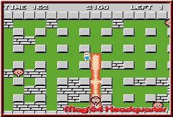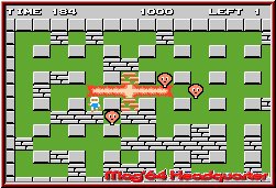 Die Gegner kommen in verschiedenen Varianten daher und bringen auch unterschiedlich Punkte. Der einfachste 100 Punkte, während der härteste und auch schnellste Gegner im Spiel 8000 Punkte bringt. Wer also auf Scorejagd gehen will hat genügend Möglichkeiten diesen selber zu beeinflussen. Mit der Zeit werden die Gegner nicht nur mehr, sondern auch schneller und etwas trickreicher in der Wahl ihrer Bahnen. Dann heißt es oftmals aufpassen das man sich nicht selber einbaut, oder in den Radius seiner vielleicht gerade gepushten Bomben läuft. Die Hektik nimmt also je länger man spielt zu. Genervt hat mich persönlich oftmals das Tor Gesuche am Ende. Selbst wenn alle Gegner weg sind und die Zeit einem im Nacken sitzt muß dieses Tor gefunden werden. Allerdings muß man dazu jeden Stein in der Stage wegbomben um das Tor zu finden. Manches Game Over ist einfach nur aus dieser Situation heraus entstanden. Im gesamten ist das etwas träge Gameplay der Schwachpunkt. Wenn man das mit den heutigen Bomberman Spielen vergleicht, die auch nicht unbedingt mehr Kosten fällt das Original hier ab.