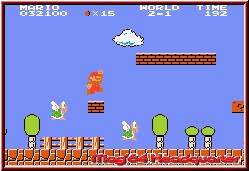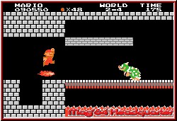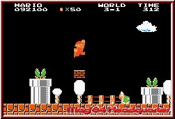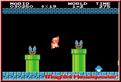 Beginnt das Spiel so fühlt man sich schnell an alte Zeiten erinnert. Das beginnt schon bei der typischen Level Abfolge 1-1, 1-2 u.s.w. 8 Welten liegen vor euch, die je in 4 Level eingeteilt sind und am Ende mit einem Bowser Schloß Abschluß finden an dessen Ende Ihr zwar keinen Endkampf im gewohnten Sinne bestreiten müßt, aber zumindest an Bowser vorbei müßt um einen rettenden Schalter zu erreichen. Wie im Original lauft Ihr dabei von links nach rechts und müßt neben allerlei Gegnern auch die unterschiedlichsten Hindernisse überwinden. Die Steuerung ist haargenau wie auf dem NES. Alle Level gemein haben ein Zeitlimit, das oben rechts im Screen angezeigt wird. Schafft es Mario oder auch Luigi, den man ebenfalls anwählen kann nicht in der Zeit das Ende zu erreichen verliert man ein Leben. Auf eurem Weg zum Ziel gibt es aber auch die berühmten Items die euch helfen. So natürlich die Münzen, die überall im Spiel verteilt sind. Mal liegen sie einfach herum und man muß von unten an Steinklötze springen die Münzen beinhalten. Weiterhin findet man unter den Klözen auch die Geburtsstunde von Super Mario. Nämlich den Power Pilz, der aus klein Mario den Super Mario macht. Dieser ist jetzt doppelt so groß und kann nun auch Steinklötze zerstören. Findet man nochmals so ein Feld, das meist als Fragezeichenblock vorhanden ist wird Mario zum Schützen. Jetzt findet er eine Blume und kann kleine Feuerbälle schießen. Denn überall in den Leveln warten auch Gegner auf euch. Neben den Koopa's trifft man auch auf Lakitu, der hier aber noch mit kleinen Stachelgegner wirft. Für das zerstören der Klötze und das erledigen der Gegner bekommt man auch Punkte, die als Highscore oben links angezeigt werden. Ebenso begegnen euch in den Leveln die berühmten grünen Röhren die man ja in fast allen Mario Spielen irgendwo findet.