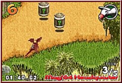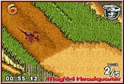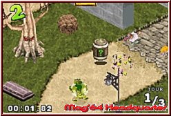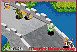 Als Unterstützung werden euch vor Kurven die entsprechenden Richtungen angezeigt, so das man bei vielen Kurven so früher Einlenken kann um diese optimal zu erwischen. Das paßt also schon ganz gut und gehört zu den besseren Steuerungen für die Iso Sicht Variante. Der Rest der Steuerung hält sich an bekannte Regularien. Per A und B Taste gebt Ihr Gas und könnt Bremsen. Die R-Taste definiert einen Sprung um Hindernissen auszweichen und die L-Taste sorgt dafür das die enthaltenen Items a la Mario Kart aktiviert werden. Gefahren wird dabei mit Ausnahme einer Strecke über 3 Runden. Nur die Sumpfstrecke bietet aufgrund der Kürze von Runden a 20 Sekunden 5 Runden. Das Spiel ist in Sachen Gameplay sehr auf die Items ausgelegt, das heißt sie haben hier eine recht große Bedeutung was Sieg oder Niederlage angeht. 10 verschiedene bietet das Spiel, die von den bekannten Geschoß Varianten, legbaren Bomben bis hin zu Schilden oder Verlangsamungsitems für die Gegnerschaft reichen. Eigentlich sind alle recht sinnvoll, sorgen aber auch dafür das es selten fahrerisch zugeht. Denn auf den Strecken findet man die Items in Form überfahrbarer Tonnen recht häufig, was auch zum entsprechen häufigem Einsatz führt. Man kann hier das Gameplay durchaus unterscheiden. Fährt man vorneweg und hat die Steuerung und Strecke ordentlich im Griff, gibt es selten Probleme die Rennen zu gewinnen. Einmal aber hinten dran und mitten im Itemgeplänkel hat man teils arge Probleme nach vorn zu kommen. Gegen euch fahren zudem 5 CPU Gegner die ebenfalls wissen wie man die Items einsetzt. Weitere Features im Gameplay sind auch die Strecken selber. Vielerorts wuseln NPC's, so will ich sie mal nennen, über die Strecken die bei Kontakt mit euch einen Dreher fabrizieren und so abrupt stoppen. Ebenso sind auf den Strecken nur die Ideallinien mit Vollspeed fahrbar. Wer auf die Wiese ausweicht oder Pfützen und sonstige Gimmicks erwischt wird verlangsamt. Perfekt fahren kann man selten, sorgt aber dafür das die Rennen auch mal spannend sein können. Bei späteren Rundenzeiten von über 1 Minute sind auch die Streckenlängen in Ordnung.