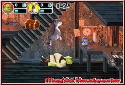 Wie der Name schon sagt ist das Ziel den oder die Gegner mit einem Slam durch die Gegend zu kicken. Dazu existiert zunächst ein solcher Slam Zähler im oberen Bildrand. Darunter findet man eine Leiste, die den sogenannten Feenstaub aufnimmt. Eigentlich könnt man auch hier sagen, jede Backpfeife auf einen Gegner füllt diese Leiste etwas. Ist sie voll kann man den Slam ansetzen. Um das ganze nun hinzubekommen hat die Steuerung eine große Bedeutung. Hier geht man teilweise einen unglücklichen Weg wie ich finde. Gutes Beispiel ist der Sprung, den man per Kreuz oben ausführt. In einem Prügler wie diesem paßt das nicht unbedingt und geht bei weitem nicht so flüssig von der Hand, als wenn man dafür die A oder B-Taste nutzt. Vor allem da hier viel und auch reichlich schräg gesprungen werden muß alles andere als easy zu bedienen. Dazu kommen nun Attacken per A und B-Taste. Deckt die A-Taste die einfache Attacke ab, so aktiviert man mit der B-Taste einen Charakterspezifischen Special. Shrek der seine grüne Wolke so auf die Charaktere losläßt kann man damit Gegner kurzzeitig bewegungsunfähig machen. Die R-Taste dient dem Blocken, während die L Taste die Nutzung diverser herumliegender Items möglich macht. Liegt z.b. ein Schwert herum greift man es mit der L Taste und schlägt seine Kontrahenten danach mit A. Kleine Variationen sind ebenfalls enthalten. So könnt Ihr im Sprung eine Bodenattacke anbringen oder beim Blocken eine Rolle ausführen um einen Konter anzubringen. Das Ziel ist es nun in jeder der Stages im Story Modus die Vorgaben zu erfüllen. Diese reichen von einer festen Anzahl von Slam's, die man als erster erreichen sollte, oder z.b. wer innerhalb von 1 Minute die meisten Slam's schafft.