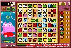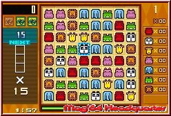 Um das Spielprinzip vorzustellen schauen wir zunächst in den Modus Zooo, der klassisches Gameplay bietet. Anders als auf dem DS muß nun zum einen alles auf einen Bildschirm passen und per Actiontasten und Steuerkreuz gesteuert werden. Wie sich zeigen sollte vermißt man wenig im Gegensatz zur DS Version. Aufgeteilt ist der GBA Screen zunächst in das große Hauptspielfeld, das links und rechts von Anzeigen begrenzt wird. Findet man links 3 Brillensymbole samt Score Anzeige, sind rechts die Tiersymbole und das aktuelle Level eingeblendet. Ganz unten im Screen findet man die vielleicht wichtigste Anzeige in Form einer Leiste, welche die noch verfügbare Zeit anzeigt. Etwas das in einem Puzzle Spiel und gerade hier sinnvoll ist und das an sich schon spaßige und hektische Gameplay unterstützt. Das Spielfeld in der Mitte des Screens besteht nun aus einem 8x8 großen Spielfeld, in dem man nun beim Start bunt zusammengewürfelt die Tiere des Zoo's als Bildervarianten vorfindet. Insgesamt 8 werden im Verlauf nutzbar und das Ziel im Spiel ist es einfach gesagt Reihen aus minimal 3 gleichen Symbolen zu erschaffen. Schafft man das verschwinden sie und alles andere rutscht wenn man so will nach. Soweit das ganze in einem Satz. ;-) Aber keine Sorge. Es steckt schon ein wenig mehr dahinter. Das Spielziel ist es solange wie möglich zu spielen und möglichst viele 3er oder mehr Tierreihen mit gleichen Symbolen zu erschaffen. Verbindet Ihr eine Reihe wird diese Anzahl dann auch in der Tieranzeige rechts daneben angezeigt.