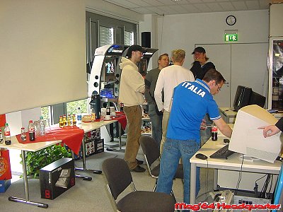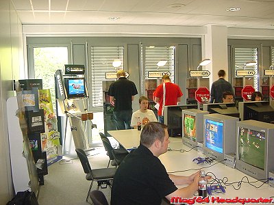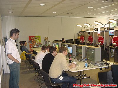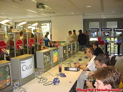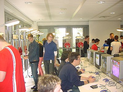 Für uns die jedesmal eine nette Fahrt nach Großostheim vor sich haben ein Tag der langen Wege. Aufstehen bevor der Hahn kräht, Berufs und Autobahnverkehr der stressigen Art und spätes Heimkommen gehören auch mittlerweile jedesmal dazu. Wobei diesmal die Heimfahrt der absolute Bringer war. Konnte man die Hinfahrt überraschend schnell in 3 ½ Stunden hinter sich bringen war die Heimfahrt mit knapp 6 Stunden eine anderes Kaliber. Vielen Dank Hambacher Dreieck! Aber was tut man nicht alles. Doch kommen wir wieder zum wichtigen Teil des Tages. Wie schon erwähnt stellt Nintendo nochmal alle wichtigen Titel der E3 vor und beschränkt sich dabei lobenswerter Weise nicht nur auf die eigenen Titel. Was in diesem Jahr dafür sorgte das soviele Titel anspielbar waren wie noch nie. Wobei mit dem DS auch ein weiteres System dafür verantwortlich war. Man könnte fast denken 2005 erscheinen soviele Titel wie noch nie für Nintendo Systeme. ;-) Aber egal, hauptsache genug um seiner Leidenschaft zu frönen. Wie immer in seinem Show Room waren nun neben den GCN Stationen die DS Varianten der Blickfang, was augenscheinlich alles etwas voller und gedrängter erscheinen ließ. Das der Andrang dieses Jahr auch größer war zeigt allein die Tatsache das Nintendo 2 Tage in Deutschland veranstalte um alle durchzuschleusen. Die letzten Jahre reichte da noch 1 Tag.