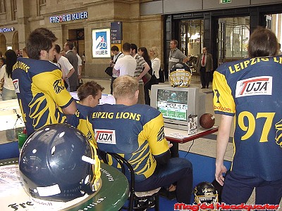 So verging die knappe Stunde erneut wie im Fluge und man konnte sich anschließend ein wenig seinem kleinen Hunger und Durst widmen. Ihr wißt ja wo es was kostenlos gibt sind die Jornalisten nicht weit. ;-) Ein Privileg das man immer gerne nutzt. Allerdings war dafür nicht soviel Zeit. Denn wie schon erwähnt begann fast gleichzeitig der Event „Come and Play“ auf dem Querbahnsteig des Leipziger Hauptbahnhofes. So luden auf einem Teil alle Hersteller mit Spielstationen zum Anspielen ein. Angefangen bei Nintendo mit diversen GCN und GBA Stationen, die man in der Classics Variante aufbaute, konnten Xbox und PS2 User ebenfalls ihrem Hobby frönen. Was mir besonders gefallen hat und beileibe nicht die Regel ist war die Version mit der man gegen die Football Mannschaft der Leipzig Lions spielen konnte. Wer es sich zutraute konnte also gegen die echten Cracks der Leipzig Lions am GameCube Madden NFL 2004 spielen. Richtig gut lief es für mich nicht, dafür ist es aber sehr interessant Meinungen von Spielern zu hören, die diese Sportart auch in echt betreiben. Mal sehen ob wir da nicht einen Kontakt für die 2005er Version gefunden haben und vielleicht einen kleinen Zusatzartikel bringen werden wenn richtige Football Spieler Hand an ein solches Game legen. So nach dem Motto, gib Tiger Woods ein Pad in die Hand und schaun’mer mal was dabei rauskommt. ;-)