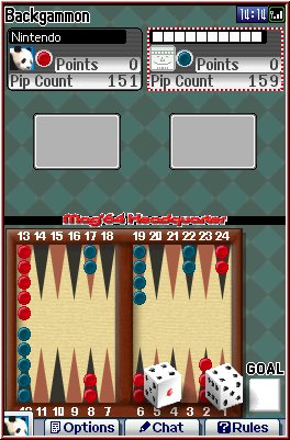 2 Spieler treten bei "Backgammon" gegeneinander an. Ihr versucht Eure Steine in das "Heimfeld" zu bewegen, um sie daraufhin abzutragen. Nach dem erfolgreichen Abtragen aller Steine geht man als Sieger aus dem Spiel hervor.