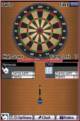 Bei "Dart" dürfen 2-8 Spieler gegeneinander antreten. In der Nintendo DS-Version habt Ihr die Möglichkeit unter drei Varianten zu wählen: "01", Highscore" sowie "Cricket". Abhängig von den Regeln, geht es bei "01" beispielsweise darum, die erzielten Werte auf der Dartscheibe vom Score abzuziehen, um schließlich bei 0 zu landen. Da die DS-Steuerung hierfür etwas zu ungenau ist, kann das Spiel als reine Glückssache angesehen werden.