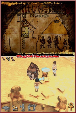 In fünf Kapitel unterteilt, werdet Ihr rund acht bis zehn Stunden zu tun haben, ehe Ihr das Ende des Spieles erreichen werdet und auf einer mühevollen Reise durch die Wüste bis hin zum Totenreich so ziemlich jede Umgebung erkundet, die mit dem auf Assil lastenden Fluch in Verbindung gebracht wird. Vier Tätigkeits-Icons prangen am unteren Touchscreen-Rand und sind im Wesentlichen dafür verantwortlich, dass Assil sein Abenteuer bestehen kann. Mithilfe des Auges betrachtet der kleine Ägypterjunge seine Umgebung, und erhält zu allen relevanten Objekten Informationsbeschreibungen, die in komplett deutscher Sprachausgabe aus dem Nintendo DS hallen. Der erste Titel, der im Gesamten mit deutscher Sprache aufwartet und dadurch eine gehörige Portion Atmosphäre versprüht! Auch alle Gespräche, ob kurz oder langwierig, wurden synchronisiert, so dass einige Stunden Sprachausgabe zusammenkommen. Die Rätseldichte ist relativ hoch, Gegenstände müssen miteinander kombiniert werden, beispielsweise ein Steinarm, den Ihr in ein Hemd einwickelt und mit dieser Kombination in tiefen Gewässern nach einem Krokodil Ausschau haltet, welches sich kurz darauf, nach einem heftigen Biss, seine Zähne am Stein ausbeißt. Autsch!!! Oder aber: „Benutze Baseball mit Schakal!" Schon einmal gemacht? Viel Spaß dann in der Unterwelt…