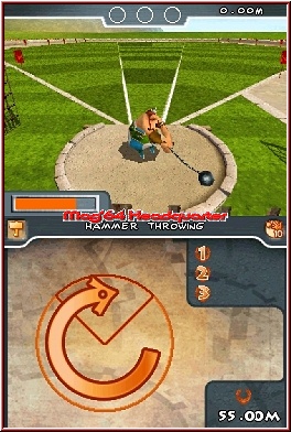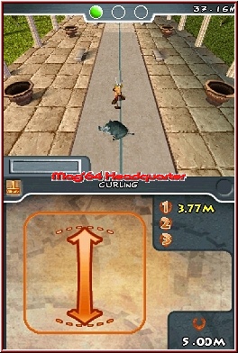 Weil zu Beginn des Spieles noch nicht alle Bereiche zugänglich sind, gilt es, erfolgreich in sportlicher Hinsicht zu wirken. Erst nachdem der erste Wettbewerb beendet wurde, eröffnen sich weitere Bereiche. Übrigens erhaltet Ihr für erfolgreich ausgeführte Disziplinen Preisgelder, die wiederum im Laden gewinnbringend in nützliche Gegenstände angelegt werden dürfen. Um auch alle Medaillen eines Wettkampfes abzustauben, bedarf es seine zuvor erreichten Ergebnisse nochmals zu unterbieten. Mit der Zeit stellt Euch das Spiel regelrecht vor große Herausforderungen, die nur mit viel Geschick und Disziplin bewältigt werden können. Zunächst werfen wir einen kurzen Blick auf einige der zahlreichen Minispiel-Ereignisse und erklären Euch deren spielerische Vorgehensweise. Bewusst picken wir hierbei einige "Sportarten" heraus - der Rest erwartet Euch auf dem eigenen Handheld ;-) . So ist der 100-Meter-Lauf das Paradebeispiel für die Vorgehensweise bei der Minispiel-Umsetzung. Mit dem Stylus rubbelt Ihr über den Touchscreen und gebt Asterix hierdurch die Sporen. Im Punchingball zieht Ihr einen Halbkreis - nach der Devise: je schneller, desto besser. Obelix ist König des Sackhüpfens, ebenso aber prädestinierter Vielfresser. Wildschweine verschlingt er mir nichts dir nichts, doch davor solltet Ihr sie mithilfe des Mikrofons (Pusten ist angesagt!) kühlen. Beim Zaubertrankzubereiten rührt Ihr kräftig die Brühe und wählt zwischen den vorbei fliegenden Zutaten aus, andererseits beschleunigt Ihr Asterix per Touchpen, um ihn schließlich im Stabhochsprung dank einer kräftigen Lunge zu ungeahnten Höhen zu verhelfen. Ob Krötenköpfen (ähnlich des Fußballspiels, versteht sich), Gewichtheben oder schier unmögliche Liegestützmengen in wenigen Sekunden - "Asterix bei den Olympischen Spielen" ist vollgepackt mit witzigen Ideen und einer eingängigen Umsetzungsweise. Im rechtzeitigen Moment auf den Bildschirm tippen, kreisförmige Bewegungen ausführen, pusten oder eine Kombination aller Elemente erfordern Eure gesamte Aufmerksamkeit. Der Spaß hat in diesem Titel oberste Priorität.