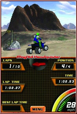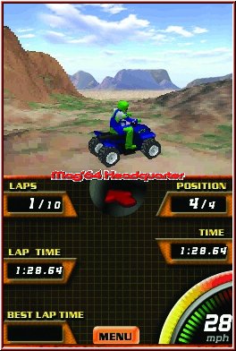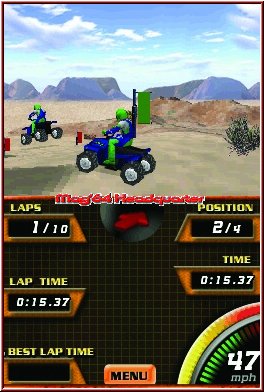 Das Speicherfeature ist ebenfalls genau wie bei den Monster Trucks umgesetzt. Bevor Ihr in ein Rennen einsteigt kann man per Select den Spielstand sichern, muß sich aber bei einem erneuten Spielen später das letzte Rennen selber suchen. Automatisch zum letzten gefahrenen Rennen bringt euch das Savegame also nicht. Vergißt man das startet man wenn man so will die Meisterschaft nochmal. Schon irgendwie fast schon lustig in seiner Machart. Wie bei den Monster Trucks ist übrigens auch hier die erste Umgebung die Wüste und der Spieler, welche beide Games besitzt und nacheinander spielt erlebt ein absolutes Deja Vu. Das kenne ich doch von irgendwoher und die grafische Gestaltung ist haargenau die gleiche. Meine schlimmste Vermutung in dem Moment, die Strecken könnten 1:1 übernommen sein bestätigte sich aber glücklicherweise nicht. Wobei auch in der Quad Variante darüber noch zu reden sein wird. Die Rennaction selber geht von 2-5 Runden auf den einzelnen Strecken gegen 3 CPU Gegner, die aber den Namen leider nicht verdienen. Ziel ist es auch hier mindestens 2. zu werden um die nächste Strecke fahren zu dürfen. Eine bessere Platzierung ist immer vorteilhafter, schließlich gibt es auch mehr Preisgeld pro Rennen. Die Streckenlängen reichen von 1 bis mehrere Minuten und gehören auf keinen Fall in den Bereich anspruchsvoll. Der große Unterschied zu den Monster Truck Rennstrecken, auch wenn sie in gleicher Umgebung stattfinden, ist das wesentlich hügeligere Gelände. Dabei sind die Strecken viel mehr verwinkelt, was sich auf den flüssigen Fahrspaß teils arg auswirken sollte. Beim Thema Steuerung gilt es mit dem Kreuz zu lenken, per A und B Gas und Bremse zu betätigen und mittels A+B in der Luft Stunts auszuführen. Umfunktioniert wurden hier die Tastenfunktionen L und R, die euch einen Seitenblick erlauben um zu sehen was die Gegner machen. Besser geeignet ist dafür eigentlich die Karte auf dem Touch Screen. Wie bei Monster Trucks auch werden euch hier Infos über Runden, Zeit oder Platzierung angezeigt.