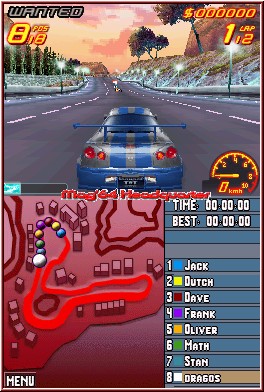 Zwar mit 5 Rubriken weniger als im Vorgänger bieten diese mit bis zu 4 Upgrades pro Rubrik genügend Möglichkeiten den Wagen zu tunen. Alles steht zu Beginn eh noch nicht zur Verfügung. Wie sich das Tuning auswirkt sieht man zudem anhand der technischen Daten, so das man sieht ob sich das ganze lohnt oder eben nicht. Diese Änderungen speichert man eh dauerhaft, so das diesem Teil schon eine wichtige Bedeutung zukommt. Auch deshalb weil man wie schon erwähnt den Wagen vielleicht später wieder braucht. Man tuned also nie umsonst. Hat man sein Geld unter die Leute gebraucht oder auch nicht kann man sich nun an das eigentliche Rennen wagen. Auch wenn es mehrere Varianten gibt kümmern wir uns beim Thema Steuerung und Engine um die normalen Rundenrennen. Angefangen bei 2 Runden werden diese mit zunehmender Spieldauer erhöht. Einmal gestartet erinnert vieles an den Vorgänger. Man hat auf den ersten Blick spielerisch eigentlich wenig geändert. Gefahren wird dabei immer gegen 7 CPU Gegner. Dabei ist auch das Anfangssystem wieder gleich und Ihr startet immer am Ende des Feldes.. Auch im zweiten Teil nichts was mit Rechenpower zu tun hat, wie spätere Massenansammlungen innerhalb eines Screens deutlichst zeigen. Ziel ist es nun innerhalb der vorgegebenen Zeit alle zu überholen und möglichst Erster zu werden. Wie immer sehr aufgeräumt wie schon im ersten Teil präsentiert sich dabei die Aufteilung der Anzeigen auf die beiden Screens. Der untere Touch Screen wird zwar nicht in seinem ursprünglichen Zweck genutzt, sondern bietet die komplette Strecke als Draufsicht. Positiv aber deshalb weil man Kurven und Entfernungen ganz anders einschätzen kann. Dazu sind auch alle Fahrzeuge als fahrende Punkte angezeigt, was auch nicht unwichtig ist. Weiterhin findet man die Zeit und Rundenanzeige im unteren Screen, während Platzierung und die Nitro Anzeige oben zu finden sind.