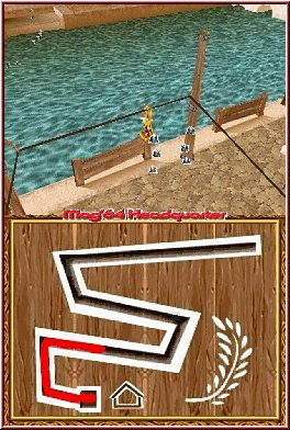 Die Ziele in den Leveln sind nun völlig verschiedener Natur und reichen vom Erreichen einer finalen Tür, über das Eliminieren einen bestimmten Gegner Anzahl bis hin zum lösen kleinerer Rätsel die erst den Weg freimachen. Die Gegner sind wie nicht anders zu erwarten die Römer. Je weiter Ihr voran kommt um so schwerer werden die Varianten. Lustig gemacht ist die zwar immer gleiche, aber eben typischen Backpfeifen Action. Steht ein Gegner im Weg könnt Ihr ihm zwar auch auf den Kopf springen, aber auch per Backpfeifen solange auf diese Einschlagen bis diese schräg in die Luft wegschnipsen. Dazwischen warten nun je nach Level zum einen verschiedene Aufgaben. Sind es Rätsel werden diese meist in Form von Schalter und Fackelaction umgesetzt. Z.b. öffnet sich die finale Tür nur wenn man 4 Schalter umlegt. Also gilt es diese zu finden. Nicht so schwer gemacht verläuft man sich keinesfalls, geht manche Level aber gerne mal vor und zurück um diese kleinen Abhängigkeiten zu lösen. Meist bewacht zudem immer ein bestimmter Gegner einen Schalter. Positiv ist aber auch die Einbindung des Touch Screens. 2 Varianten gibt es dabei. Zum einen die Levelaufgaben und die Minispiele. Bei den Levelaufgaben kann man gerne mal ein paar Nerven lassen. Hier muß man als Spieler oftmals eine Lore aktivieren und danach mit Asterix den Startpunkt finden. Einmal drin erscheint nun im Touch Screen eine mehr oder weniger verwinkelte Führung. In dieser muß man vom Startpunkt die Strecke nachzeichnen, ohne die Ränder zu berühren. Ansonsten beginnt man die Fahrt von neuem. Wer hier kein ruhiges Händchen hat wird schnell mal einen Frustschrei lassen. Ich weiß wovon ich spreche. ;-) Teilweise habe ich den DS sehr unkonventionell gehalten um diese Aufgaben zu schaffen. Zweite Variante sind die Minispiele, die man später auch per Hautmenu angehen kann. Hier wartet dann auch mal 3D Action auf euch. Z.b. gilt es in verschiedenen Schwierigkeiten einen 3D Tunnel zu durchlaufen. Einmal gilt es Bomben auszuweichen und Schlüssel einzusammeln, während in anderen Varianten herumlaufende Gegner erwischt werden müssen. Andere Variante ist die Arena, in der man im Kreis herumläuft und bestimmte römische Soldaten niedermähen muß um das ganze zu schaffen. Sind durchaus nett gemacht und auch passend in der Anzahl eingestreut.