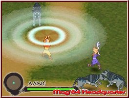Nachdem Ihr zu Beginn des Spiels alleine unterwegs wart, gesellen sich bereits nach kurzer Zeit die drei Weggefährten zu Euch, die von der CPU gesteuert, Euch nun zu jeder Zeit folgen. Auf Wunsch entscheidet Ihr Euch mit dem Touchpen für ein anderes Gruppenmitglied und übernehmt dessen Kontrolle. Jeder Charakter hat spezifische Fähigkeiten und kann diese im Kampf effektiv einsetzen. So seht Ihr im oberen Bildschirm die "Bändigen"-Anzeige, die sich nach wenigen Sekunden automatisch auffüllt. Auf Knopfdruck lässt der von Euch gesteuerte Held einen magischen Angriff vom Stapel, der sich gewaschen hat. Aang, der Avatar, ist zu Beginn im Besitz eines Luftstoßangriffs, schwingt sich nach Freischaltung einer weiteren Fähigkeit auf einen rasend schnellen Luftball, der die Widersacher von den Beinen fegt, um letztendlich einen durchschlagenden Tornado zu erzeugen, der die Opponenten in seinen Wirbel mit einschließt und kräftig an ihrer Energie zehrt. Ebenso sind die anderen drei Gruppenmitglieder mit der Macht der Elemente gesegnet. Sokka schwingt ihre Kriegskeule im direkten Angriff, schleudert einen Bumerang in die Gegnermassen, bringt Knallfrösche zum effektgewaltigen Knall oder zündet - dank der "Bändiger"-Begabungen eine bombastische Bombe. Haru hingegen wirft bevorzugt Steine nach seinen Feinden oder schlägt mit aller Gewalt auf den Boden nieder, um eine massive Angriffswelle zu erzeugen. Katara friert das Gegenüber kurzzeitig in einem Eisblock ein oder heilt ihre Mitstreiter im Kampf und bewahrt sie somit vor einem Lebensverlust. Sollte eine Eurer Spielfiguren in die Knie gehen, ist der Kampf für diese Figur zwar zu Ende und sie erhält keine Erfahrungspunkte, die Restgruppe kämpft allerdings weiter. Überhaupt sind die Rücksetzpunkte im Spiel fair verteilt worden. So wird bei einem Gruppen-Game-over das Duell mit den Feinden einfach von Beginn an wiederholt.