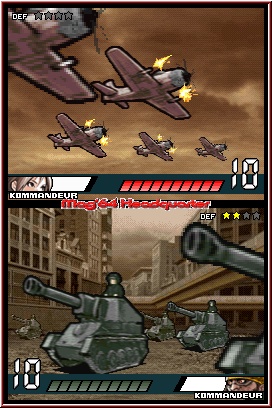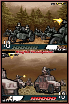 Neu bei Advance Wars Dark Conflict ist die Ko Situation. Natürlich gibt es wieder einmal verschiedene Ko´s, die jeweils unterschiedliche Eigenschaften an den Tag legen. Neu ist nun, das der Ko nicht über die gesamte Armee Einfluß nimmt und seine Gabe steigert. Man muß den Ko auf der Fabrik, Flughafen oder Seehafen auf eine Einheit zuordnen. Dazu wählt man die gewünschte Einheit aus (zweimal A drücken und den Punkt "Ko" auswählen) und kann nun optisch an dem Ausrufezeichen, seine Führungseinheit erkennen. Diese Einheiten haben nun gegenüber vergleichbaren gegnerischen Truppen einen Vorteil, was Offensive und Verteidigung betrifft. Bitte nicht verwechseln mit Unverwundbarkeit. Auch diese Einheit ist zu vernichten, es dauert nur etwas länger. Die Ko Einheit steigert nun ihre Gabenleiste, wenn sie erfolgreich agiert und wenn sie gefüllt ist, kann die Gabe eingesetzt werden. Verliert ihr aber die Ko Einheit, müßt ihr eine neue produzieren und mit dieser wieder von vorn beginnen, was die Fülle der Gabenleiste betrifft. In meinen Augen ist das ein Schritt in die richtige Richtung, denn so wird es ein wenig spannender und man muß auf diese Ko Einheit ein wenig mehr Acht geben. Auch normale Einheiten können ihre Wertigkeit steigern, wenn sie erfolgreich kämpfen. Insgesamt gibt es drei Stufen der Aufwertung, was sie im Kampf ein klein wenig bevorteilt.