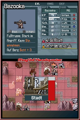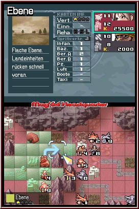 Wenn man den Cursor auf der Karte irgendwo platziert, bekommen wir über den Topscreen diverse Informationen über diesen Fleck. So erfahren wir zum Bsp. das man in einer Stadt, wenn man die erobert hat, seine angeschlagenen Truppen auffrischen kann, Munition und Sprit zuführen kann. Die goldenen Sterne symbolisieren die Verteidigungswerte an diesem Ort. In den Fabriken, wo wir unsere Einheiten produzieren können, erfahren wir auch nicht nur den Preis, sondern auch welche gegnerischen Einheiten für diese Truppengattung gefährlich werden kann. Mit dem roten Ausrufezeichen sind besonders die Truppen gekennzeichnet, die sehr gefährlich sind. Das gelbe Ausrufezeichen symbolisiert die Einheiten, die nicht ganz so gefährlich werden können.