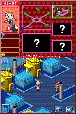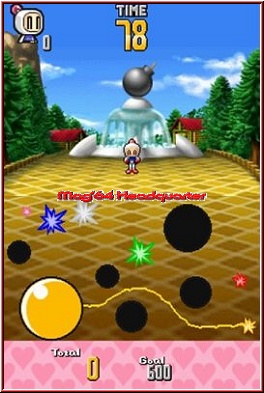 Im Piraten-Freizeitpark angekommen, dürft Ihr Bomberman komplett mit dem Touchpen steuern und durch die teils arg verwinkelte Landschaft führen. Eine Karte auf dem Topscreen gibt Euch Aufschluss darüber, wo Ihr Euch derzeit befindet und welche Bereiche Ihr bislang noch nicht erkundet habt. Die Spielwelt ist in verschiedene Zonen aufgeteilt (Pik Zone, Karo Zone, Herz Zone, Kreuz Zone) innerhalb derer verschiedenste Attraktionen zu finden sind, die Ihr mit Eurem Alter Ego besuchen könnt. Selbstverständlich ist nicht jeder Ort von Anfang an zugänglich, allerdings werdet Ihr durch erfolgreiches Abschließen von unterhaltsamen Spielen Karten in Euren Besitz bringen, die wiederum Tore zu neuen Bereichen öffnen. So gibt es in der blauen Pik Zone blaue Karten, jeweils eine nach erfolgreichem Minispiel. Also steuert Ihr Weiß Bum zum nächsten Haus, wo es sogleich mit der Action losgeht. Ausgezeichnet fanden wir, dass die Entwickler alle nur erdenklichen Touchscreen-Verwendungen in das Spiel einbauten. So müsst Ihr in einem Spielchen beispielsweise Bomberman auf Kugeln balancieren lassen und durch Rollbewegungen gen Ziel beschleunigen. Zwischendurch hüpft dieser von Kugel zu Kugel, um einem Zusammenstoß entgehen zu können. Ein anderes Mal versucht Ihr den Protagonisten weit in den Himmel zu katapultieren, um dort befindliche Bomben zur Explosion zu bringen und die Zielmarkierung zu erreichen. Ebenso witzig sind die zahllosen Versuche eine Plattform von kurz vor der Zündung stehenden Sprengsätzen zu befreien, die Ihr mit mächtigen Touchpen-Zügen über den Rand der Ebene hinaus bugsiert. Bei einer eventuellen Explosion erscheint Bomberman nach wenigen Sekunden wieder auf dem Bildschirm.