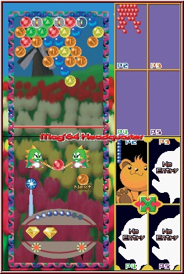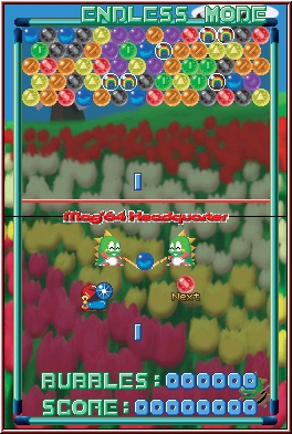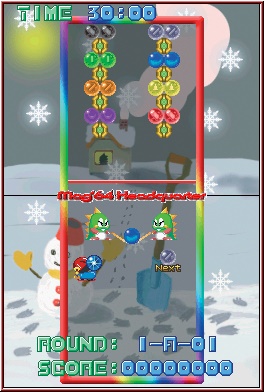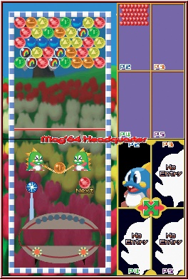 Im Touch Screen steht nun euer Charakter neben einer Abschussvorrichtung, die mit einer Linie gekennzeichnet ist und damit die Schussrichtung anzeigt. Allerdings jetzt nicht mehr bis zum Ende des Spielbereiches. Macht es anfangs ein wenig schwerer. Auf dieser Vorrichtung erscheint nun eine farbige Blase, die man damit nach oben in das Action Feld schießen muss. Wahlweise und je nach Einstellung per Kreuz und Tastenaction, oder eben in dem man die Blase antippt und nach unten zieht und ähnlich dem Flipper Prinzip nach oben schnipsen lässt. Grundprinzip ist es durch Kombinationen von Blasen gleicher Farbe oder Wertigkeit den Top Screen zu leeren. Denn wie bei Tetris auch erscheinen neue Blasen und füllen den Screen. Unterschied ist eben das umgekehrte Prinzip. So erscheinen oben nach und nach Reihen verschiedenster Blasen. Neben einfachen und farbigen Standard Blasen gibt es sogenannte Bonus und Spezialblasen, die bei richtiger Kombination durch die geschossenen mehr Punkte bringen und den Screen auch in einer Kettenreaktion leeren können. Schießt man z.b. von unten eine grüne Blase an 2 nebeneinander liegende grüne im Actionfeld, ist ein Miniziel erreicht und diese Blasen verschwinden aus dem Actionfeld. Wie immer in solchen Spielen kommen die Blasen aber nicht so wie ihr sie braucht. Mit der Zeit gilt es sehr schnell zu reagieren. Vorteil ist das Blasen verschiedener Farben, die an Paaren hängen mit abfallen, wenn man dem Paar gleicher Farbe eine weitere Blase dieser Farbe zuschießt. So muss vor allem sehr viel kombiniert werden um zum einen den Screen nicht zu voll zu bauen, aber so das man immer gleich mehrere Reihen wegbröseln kann. Positiv ist dabei natürlich die Tatsache, das beide Steuervarianten sehr einfach von der Hand gehen und bedingt durch den Touch Screen in der Pen Version fast noch einen Tick genauer ist als mit Kreuz und Tasten. Hier gibt es also nichts zu meckern in meinen Augen. Dabei ist das Spiel physikalisch korrekt und bietet natürlich auch wieder das Banden Feature. Benutzt Ihr die Bande, so prallt die Blase so ab wie sie sollte. Damit sind auch Bereiche möglich, die man auf direktem Wege durch nach oben schießen nicht erreicht. Baut Ihr euch aber zu, kommen euch eure Gebilde von oben immer näher. Am Ende ist das Spiel vorbei, sobald die erste Blase unten in den Bereich eures Charakters fällt.