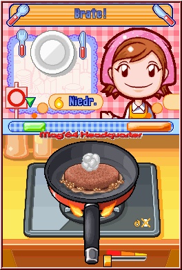 Im nächsten Moment gilt es die Nudeln mitsamt dem Wasser abzugießen, um kurz darauf eine Zwiebel zu schneiden. Wie könnte dies anders funktionieren, als durch schnelles Berühren des scharfen Schneidewerkzeuges mit dem Stylus? Nicht nur Zwiebeln schneidet Ihr auf diese Weise, sondern auch Paprika und andere Gemüsesorten. Anstrengender wird es da schon beim Fleischzerkleinern, da hierbei der Touchpen hoch und runter bewegt werden muss, um die Filetstücke aus dem unhandlichen Fleischbrocken zu lösen - was aber bei unserem Gericht nicht vonnöten ist. Als nächstes werdet Ihr die bereits bearbeiteten Zutaten in einer Pfanne anbraten und mit dem Stylus verteilen, so dass keine der leckeren Zutaten anbrennt. Letztendlich würde dadurch Euer Kochresultat, das durch eine Punktebewertung belohnt wird, deutlich eingeschränkt werden. Eine verbrannte Mahlzeit schmeckt schließlich scheußlich, sollte es dennoch so weit kommen, übernimmt Mama den Part der Köchin und hilft Euch somit aus der Patsche. Nun hackt Ihr als nächstes eine Zwiebel, indem Ihr sie zuvor anschneidet und dann in gekonnter Weise in kleine Würfelchen schneidet. Bedeckt nun eine Pfanne mit Butter - vergleichbar mit einem Zeichenprogramm, bei welchem Ihr eine Fläche so schnell als möglich ausmalen sollt. Bratet nun die Zwiebelstückchen an und gebt Sie nun in einem minispielähnlichen Zutaten-Erkennen-Spiel in einen großen Bottich, der mit Hackfleisch gefüllt ist: hinein kommen nun Semmelbrösel, dann das Ei, Milch und schließlich die Zwiebelchen.