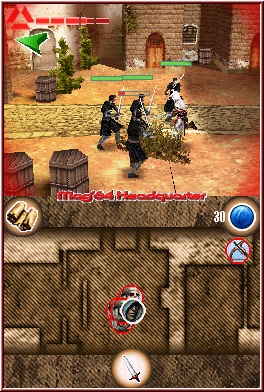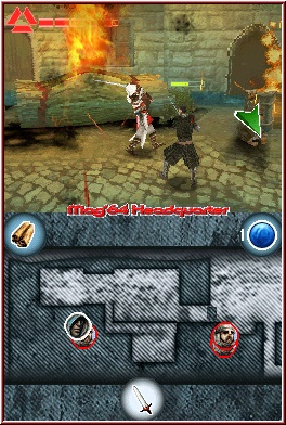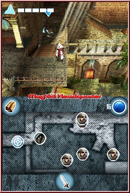 Beginnt ihr ein neues Spiel, dürft Ihr zunächst einen von mehreren Schwierigkeitsgraden wählen. Neben Leicht und Mittel gibt es auch einen Schweren Grad, den Ihr aber erst bekommt, sobald das Spiel einmal beendet ist. Leider etwas dürftig in Sachen Belohnungen. Denn die Unterschiede sind marginal und beschränken sich meist auf das Gegnerverhalten und weniger Zeit in den Minispielen. Auswirkungen auf den Storyverlauf hat das ganze leider nicht. Assassins Creed auf dem DS kann man in vielerlei Hinsicht mit einem Fluch der Karibik 3 vergleichen. Zumindest was den spielerischen Aspekt angeht. Auch hier besteht die Hauptmischung in Sachen Gameplay aus Kampf und Geschicklichkeitsaction, wobei in Assassins Creed die Jumper und somit Geschicklichkeitseinlagen um einiges höher sind und mehr Bedeutung haben. Zunächst überzeugt das Spiel durch seine exzellente 3D Darstellung, welche in dieser Form nur wenige Konkurrenten zu bieten haben. Dabei ist die Kamera auf das Geschehen meist etwas entfernt angebracht und zeigt den Helden Altair somit aus einer Third Person Sicht. Je nach Plattform Action und Tiefe des 3D Areals geht es meist von links nach rechts und im Wechsel auch mal in die Tiefe des Screens. Dabei spielt sich die reine Action auf dem Top Screen ab, während der Touch Screen als Karte fungiert und die kommende Umgebung als Draufsicht samt darin enthaltener Symbole darstellt. Ihr findet so auf der Karte Wege und Vorsprünge, aber auch in Form kleiner Köpfe und Symbole NPC’s, Gegner in Form diverser Wachen und natürlich die Zielpunkte der jeweiligen Mission. Das Spiel selber ist linear gestaltet, was die Storyabläufe und damit die Locations angeht. 5 gibt es, die im gesamten 12 Kapitel für den Spieler bieten und euch in Städte, unterirdische Anlagen und Tempel führen. Passend umgesetzt ist der Bezug zur Epoche sehr groß und wunderbar gelungen.