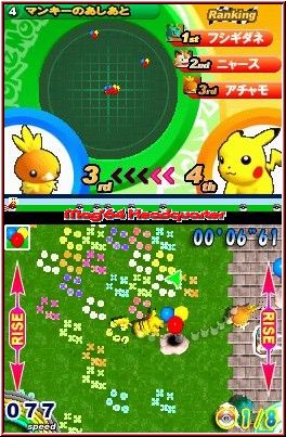 Wenn man mit seinem Ballon sein nächstes Ziel anvisiert, muß man auch beachten, wo und wie man landet. Links und rechts am Bildschirm befinden sich zwei Balken, womit wir den Ballon landen lassen. Befinden wir uns im Landeanflug müssen wir auch auf Winde achten, die im späteren Spielverlauf stärker werden und einen ständig korrigieren lassen müssen. Um die Landung zu forcieren, kann man auch einen Ballon platzen lassen, in dem man seinen Touchpen draufsticht. Dann geht es zwar schneller hinab, aber das Risiko, das Pikachu sich weh tut steigt. Wir erkennen es dann schon vorher an den Ausrufezeichen auf dem Screen, das irgend etwas im Busche ist. Nach einer harten Landung muß man Pikachu mit seinem Pen wieder zu Bewusstsein bringen, was einige Zeit kostet. Man sollte auch auf Bäume achten, wenn man landet. Sollte man dennoch dahin getrieben werden, geht es noch einmal in die Luft und man bekommt einen neuen Landeversuch. Aber das kostet eben alles Zeit, die man in den späteren Rennen eigentlich nicht hat.