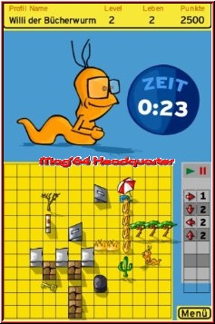 Der wohl lohnendste Blick ist jener, den man in den „Quiz-Dschungel" wirft: Im Multiple-Choice-Verfahren trefft Ihr hier auf leichte – oft auch recht happige – Fragen, die es zu beantworten gilt. Vor allem die Herkunft von Wortbedeutungen wird abgefragt, häufig hilft dann nur noch ein klärender Blick in das nächste etymologische Lexikon. Weiter geht es in der „Logik-Wüste". Dort verhelft Ihr dem Bücherwurm Willi dazu, zu seinem Sonnenschirm zu gelangen, der sich neben einem Wasserloch befindet. Hierzu setzt Ihr Pfeil-Icons in korrekter Abhängigkeit auf ein kariertes Spielfeld, um den Wurm den richtigen Weg laufen zu lassen. Diverse Rampen, Löcher, Schranken oder Tore versperren Euch den Weg und müssen zunächst überwunden werden. Was hat das allerdings mit dem Titel „Der Dativ ist dem Genitiv sein Tod" zu tun? Diese Frage steht noch immer im Raum und wird auch beim nächsten Gameplay-Element kaum geklärt werden.