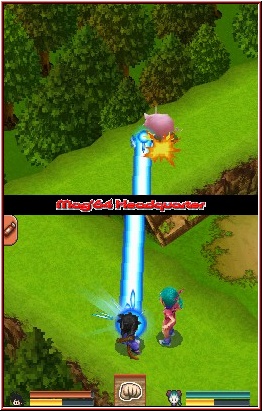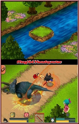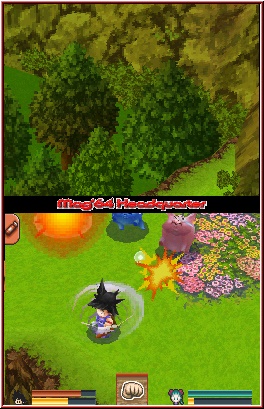 So beginnt das Spiel auch mit Son Goku allein, den man hier wirklich als absoluten Hinterwäldler kennenlernt. Er weiß weder was ein Mädchen ist, noch was hinter seinem Wald so vor sich geht. Alles was Bulma später als völlig Normal anpreist, sind für Son Goku erst mal spanische Dörfer. Egal ob das z.b. Dynakapseln sind oder Dinge wie Ventilatoren und Lampen. ;-) Aber zumindest zeigt man euch so spielerisch schnell einige Grundlagen. Auch was die Sequenzen angeht, bekommt man diese Machart sehr schnell zu sehen. Über beide Screens gehend, sind diese im Serienstil gehalten und haben vor allem eine sehr gute Mimik mit an Bord. Sehr zahlreich und durchaus lang, fehlt eigentlich nur eine dauernde Sprachausgabe. Hier gibt es dann nur einige original Samples der beteiligten Charaktere zu hören. Zum anderen führt man euch in das Grundgameplay ein und lässt euch erste Erfahrungen mit der Steuerung und der Sichtweise erleben. Origins ist dabei ganz im Stile der Adventure Spiele in der Third Person Sicht aus einer erhöhten Kameraposition umgesetzt. Positiv hier das auch die Umgebung komplett über beide Screens gezeigt wird. Feature wie eine Karte oder das Inventory mit mitgeführten Gegenständen wird über ein Menu abgedeckt, das man per Pen in den Touch Screen ziehen kann. Dabei pausiert das Spiel, was gerade bei Boss Kämpfen und dem damit verbundenen Einnehmen von Heilitems nicht das Schlechteste ist. Gesteuert werden kann Son Goku wie schon angesprochen in 2 Varianten. Zum einen könnt Ihr eben einstellen, ob Ihr lieber mit der herkömmlichen Variante spielen wollt, also mit dem Steuerkreuz, oder ob ihr wie bei den DS Zelda Spielen per Pen Position auf dem Touch Screen agieren wollt. Aber selbst bei der Kreuz Variante ist der Touch Screen weiterhin reichlich in Benutzung. Die Grundlage der Aktionsvielfalt ist der Modus, den Son Goku ausführt. Da gibt es einmal den Schlagmodus und die Stabvariante. Wahlweise über ein antippbares Symbol oder eine Taste wechselt man zwischen beiden durch. Unterschiede sind vor allem beim Thema Reichweite zu finden. Denn Gegner attackieren oder z.b. auch Schalter drücken kann man mit beiden Varianten. Aber nur mit dem Stab kann Son Goku auch Attacken und Aktionen auf eine bestimmte Entfernung ausüben. So zeigt man euch zu Beginn erst mal das Laufsystem und einige erste Gegner Kontakte. Alles was Son Goku in dieser Hinsicht tun kann, wird auch über Laufbewegungen umgesetzt. Will er einen Stein aufheben, läuft man an ihn heran und hebt ihn auf. Soll er über eine Schlucht springen, Dinge schieben so gilt es dies ebenfalls über das Bewegen des Charakters auszuführen. Ganz anders z.b. das Bekämpfen der Gegner. Je nach Modus muss man an ihnen direkt dran stehen, oder kann per Stab auch aus einer gewissen Entfernung agieren. Um diese zu Bekämpfen muss man die Gegner direkt Antippen über den Touch Screen. Phantasy Star ähnlich kann man Kombo Attacken ausführen, wenn man ein bestimmten Timing verinnerlicht und bringt so eben mehrere Schläge in kurzen Abständen an.