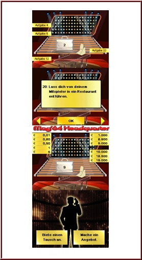 So weit, so gut. Je mehr Koffer "Lebewohl" gesagt haben und solange die Chance auf hohe Gewinne immer noch besteht, desto bessere Angebote wird Euch der Banker unterbreiten. Im Grunde will er Euch aus dem Geschäft rauskaufen, da - so nimmt man als Zuschauer, respektive Spieler an - somit der Verlust für den Sender minimiert werde. Immerhin wäre es möglich, dass der Spieler das Studio mit einem gewaltigen Betrag verlässt. Mit der Zeit werden die Angebote immer höher, die Verlockung immer größer auf das Gebot des "Geldverwalters" einzugehen. Und nun kommt der Clou: entweder besiegelt Ihr das Geschäft per Handschlag, tauscht den gewählten Koffer gegen ein anderes Exemplar aus, oder wartet solange ab, bis dass der letzte Behälter geöffnet wurde. Punkt! Das war's! Damit wäre das Spiel erklärt, tiefgründigere Inhalte könnt Ihr leider nicht erwarten. Freilich dürft Ihr die Jagd nach dem großen Geld ein weiteres Mal starten, könnt den virtuellen, ziemlich unansehnlichen "Schönheiten" beim Koffertragen zusehen und hoffen, reich nach Hause zu fahren, das war es dann aber auch schon. Nach maximal drei Runden sieht man kaum mehr Sinn darin, eine vierte hinten dran zu hängen, selbst der "Banker-Modus" kann da kaum etwas reißen: in diesem übernehmt Ihr die Rolle des Angeboterstellers - toll! Leider gestaltet sich das Betrageintippen als vollkommen unspektakulär und ist daher kaum spielenswert. Ein dritter, erst später freispielbarer Menüpunkt, der "Aufgaben-Modus" ersetzt Kofferinhalte alias Euro-Beträge in Aufgaben, die Ihr zu erledigen habt. Später dürft Ihr eigenständige Anforderungen an Euch selbst stellen. Was bringt es aber auf Zehenspitzen um das Haus zu gehen oder - kreativ wie Ihr seid - im Handstand ein Glas Wasser zu trinken? Somit ist und bleibt der klassische "Kandidaten-Modus" also doch die "beste" Wahl, auch wenn Ihr nach maximal einer halben Stunde genug habt, denn von einer spannenden, mit Sprachausgabe hinterlegten Vertonung kann man nun wirklich nicht sprechen. Das Spiel ist in seiner Präsentation eine wahre Schlaftablette und erzeugt so gut wie keine Motivation auf Seiten des Spielers.