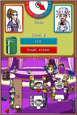 "Diner Dash" spielt sich komplett mit dem Touchpen, so dass die Knöpfe des Nintendo DS vollkommen außen vor bleiben. Das ist auch gut so, gestaltet sich der Titel in höheren Spielstufen als ungemein komplex in Hinsicht auf die Anforderungen. Aber beginnen wir von vorne mit einem Blick in den "Karriere"-Modus: Flo startet im "Diner", einem übersichtlichen Lokal mit einigen Tischen unterschiedlicher Größe. Bis auf einen Koch im Küchenbereich könnt Ihr noch nicht sonderlich viel Euer Eigen bezeichnen. Es kann also losgehen! Der erste Besucher betritt Euer Lokal, Ihr seid hoffentlich mit dem Touchpen "bewaffnet" und setzt den Gast zunächst auf einen - sofern vorhanden - Einzelplatz. Gut gemacht! Der Gast blättert eifrig die Speisekarte durch, entdeckt das Menü seiner Wahl (im Spiel gibt es lediglich pizzaähnliche Gerichte!) und winkt heftig, wenn er Euch auf seine Bestellung aufmerksam machen will. Also lauft Ihr durch einen Stylus-Druck zu Eurem Kunden und nehmt seine Bestellung auf. Mit dieser geht es weiter zur Theke, um sie dem Koch zu überreichen. In der Zwischenzeit ist bereits eine Familie samt Kleinkind und "Frischgeschlüpftem" in das Lokal geplatzt - leicht genervt suchen sie händeringend nach einem geeigneten Platz, denn der Junior ist unruhig.