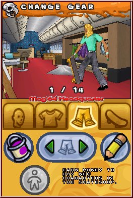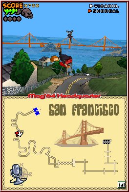 Startet Ihr das Spiel über den Punkt Spielmodi verzweigt das Game erneut. Über allem thront hier nun der Hauptmodus, die sogenannte Welttournee, die wenn man so will den eigentlichen Story Modus darstellt. Anders als sonst ist dieser Modus aber nur bedingt für das Freispielen von Inhalten verantwortlich. Den eigenen Skater entwickeln könnt Ihr aber hier. Dazu kommen die Modi Jam Session, ein Schnelles Rennen das sich nun ganz auf das neue Downhill Spielprinzip konzentriert sowie der altbekannte Just for Fun Modus und die angesprochenen Trainingsstrecken, die man auch hier nochmal angehen könnte. Kern des ganzen ist die Welttournee, die einmal mehr den ganzen Skater unter euch fordert und fast noch besser als die anderen Versionen das neue Racer Feeling mit der Trick Action verbindet. Wählt Ihr die Welttournee an erwartet euch eine Weltkarte, auf der vor euch nun 6 Locations liegen, die man teilweise nur in der DS Version findet. Was nach wenig klingt macht Vicarious Visions durch ein größeres Aufgaben Gameplay komplett wett und dreht so an der Spielzeit und Schwierigkeitsgradschraube. Ihr beginnt auch hier in der Location San Francisco und müßt dort bestimmte Ziele und Vorgaben erfüllen, ehe Ihr zur jeweils nächsten reisen dürft. Wie immer muß man nicht alle Ziele pro Location lösen um das Spiel zu beenden, bekommt aber im Gegenzug natürlich die Gelegenheit alte Orte jederzeit wieder zu besuchen. Ein Hintergrund ist auch hier die Entwicklung des Skaters, die von allen Versionen am besten gefällt. Denn in der DS Version entwickelt Ihr den Skater wie in alten Zeiten selber und nicht seine Ausrüstung. Je nach Spielfortschritt dürft Ihr also erspielte Erfahrungspunkte auf 4 Attributsleisten des Skaters verteilen und verbessert ihn so dauerhaft in den Punkten Speed, Air, Balance und dem Trick Vermögen. Und mit der Zeit, das sage ich euch, giert man nach jedem Entwicklungspunkt. ;-) Um in den Genuß dieser Punkte zu kommen müßt Ihr nun an den Locations des Spiels den örtlichen Dödeln zeigen das ein neuer Sheriff in der Stadt ist.