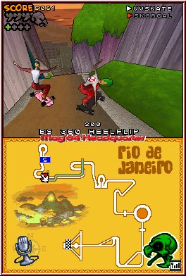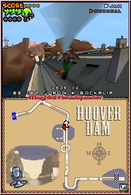 Die Sichtweise auf das Geschehen und die Nutzung der beiden Screens ist dabei vergleichbar mit dem Vorgänger. Nur das sich Tricktechnisch und grafisch schon ein wenig geändert hat. Zeigt euch der Top Screen erneut die eigentliche Action an, so dient der Touch Screen als Anzeige für die Streckenkarte und Special Tricks, die man erneut über das Antippen auslösen kann. Großartige Bedeutung im ihm zugewiesenen Sinne hat der Touch Screen sonst aber nicht. Gefahren wird das ganze erneut aus einer Third Person Sicht hinter dem Skater, der erneut sehr schön animiert und groß dargestellt ist. Dabei spielt sich nun alles, egal ob Trick Action oder das Aufgaben lösen, während der Fahrt in Richtung Tal ab. Kurz inne halten ist zwar möglich bringt aber natürlich nichts. Es geht so fast immer bergab ohne das man dabei auf Rampen, Unmengen an Rails oder sonstigen Orten für Trickaction verzichten muß. Logisch das es hier keine Funktion das "Gas geben" gibt. Einmal abgestoßen sorgt erst das Drücken der B-Taste dafür das man in die Hocke geht. Fährt man so auf eine Rampe zu oder eine Rail und läßt los springt man und man kann die gewünschte folgende Aktion auslösen. In der Luft stehen euch dabei natürlich per Kreuz und Action Tasten sehr viele Grab oder Flip Tricks zur Verfügung. Von der Anzahl her muß man dabei auf nichts verzichten was es nicht früher schon gab. Dazu kommen die X-Taste die für den Grind zuständig ist und die L und R Tasten für die extremen Slides in Kurven. Ihr könnt per Kreuz oben und unten den Manual auslösen und so wie immer Kombos verbinden. Es gibt wie immer einfache Tricks wie auch die erweiterten und natürlich die Specials. Hier kommen nun auch die Anzeigen im Screen zu ihrem Recht. Oben links findet man die Boost Anzeige. Vergleichbar mit Energiecontainern stehen euch 5 zur Verfügung. Neben der aktiven Boost Leiste findet man darunter 4 weitere die man füllen kann. Führt man Tricks aus die auch hier wieder die Leiste füllen, und diese bringen mehr Energie für den Boost als nötig ist um diese Leiste komplett zu füllen, wandern diese in die Container. Man kann also Sammeln, was bei den Rennen oder vor Rampen nie von Nachteil ist. Per Y-Taste aktiviert man den Boost. Dabei fährt man solange mit einem Schweif wie Energie vorhanden ist, kann aber auch abbrechen und verfährt die Energie also nicht in einem Rutsch.