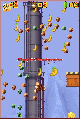 Sobald Ihr das Spiel beginnt erlebt Ihr wie immer die Anfänge der Story in sehr schönen und edel wirkenden Sequenzen. Zwar brabbeln die Helden wieder in ihrem Kauderwelsch daher, aber durch die Untertitel wißt Ihr schon worum es geht. Der Start ist wiegesagt auf der tropischen Insel, wo DK von der Idee der Riesenbanane auf dem Berg sehr angetan ist. Von nun an übernehmt Ihr seine Steuerung und bekommt zudem im Verlauf noch Zuwachs. Doch der Reihe nach. Sehr gelungen ist der Start in das Spiel, welches euch über einen langen Zeitraum in Form von Cranky alle Moves und Aktionen anhand kleiner Tutorial Stellen darlegt und zum Nachmachen animiert. Sehr passend und gut gemacht bleibt so keine Frage offen. Anfangs aller paar Meter eine dieser Einführungen, werden diese mit der Zeit natürlich weniger. Vor euch liegen nun im gesamten 6 große Hauptwelten. Alle bieten dabei eine verschiedene Anzahl von Action und Bonusleveln, so das man im gesamten auf knapp 40 kommt. Und wie immer darf in einem solchen Spiel in den Welten auch ein jeweiliger Endboß nicht fehlen. Gespielt wird dabei zunächst alles in Reihenfolge mit dem üblichen Level 1-1, 1-2 u.s.w. Allerdings und das liegt natürlich wieder im Sammelwahn begründet, könnt Ihr gespielte Level jederzeit wiederholen. Denn an findbaren Objekten, die auch zur Freischaltung der Extras dienen, gibt es wieder mehr als genug im Spiel. Bis auf die Minispiele, die man auch vereinzelt im Abenteuer Modus vorfindet spielt sich das ganze in 2D ab und ähnelt damit dem angesprochenen King of Swing vom GBA. Allerdings und das macht schon einen ersten Fortschritt aus nutzt das Spiel, ähnlich wie die Sonic Spiele auf dem DS beide Screens aus um die Spielumgebung zu zeigen. Zunächst spielt sich das eigentliche Spielgeschehen auf dem Touch Screen ab, während der Top Screen natürlich die Umgebung darüber zeigt. Je nach Bewegungen nach oben oder unten kann man sich so die Umgebungen nach beiden Richtungen anschauen. Auf den ersten Blick in Jungle Climber ein Jumper wie er im Buche steht. Aber eben nur auf den ersten Blick.