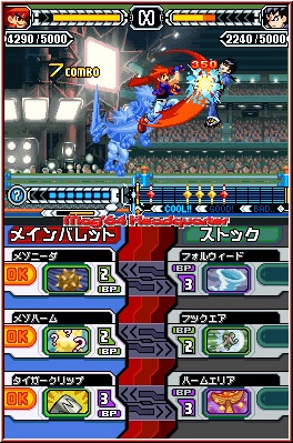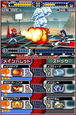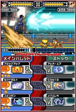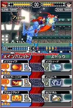 Was das Spiel ebenso ausmacht, ist die einfache Steuerung, die im Wesentlichen aus ein paar Tastenkombinationen besteht. Der Touchscreen wird nur zur Auswahl der Kampfkugeln verwendet. Apropos Kugeln: Es gibt unzählige von ihnen im Spiel. Gewisse erhaltet Ihr nach Erledigung von Feinden, andere findet Ihr wiederum in Kisten versteckt, wieder andere lassen sich käuflich erwerben. Jede Kugel besitzt einen ihr eigenen Effekt, der auf dem Bildschirm Wirkung zeigt und durch eine simple Tastenkombi aktiviert wird. Das Hauptgeschehen findet auf dem Topscreen statt, auf dem unteren Screen erkennt Ihr während der levelartigen 2D-Stages jeweils drei übereinander liegende Kugel-Hauptvorräte, rechts daneben befinden sich Reservekugeln. Somit ist es jederzeit möglich mit insgesamt sechs Bällen in’s Gefecht zu ziehen. Ob diese nun heilende Wirkung entfaltet oder heftige Gewitter erzeugt, giftige Dämpfe versprüht oder eine Bärenfalle aus dem Nichts materialisiert wird – unglaublich einfallsreich waren die Designer in diesem Fall und haben ihre Arbeit hervorragend verrichtet. Jedoch ist es nicht Sinn und Zweck und überhaupt auch gar nicht möglich, eine Kugel x-beliebig oft einzusetzen. Vielmehr benötigt Ihr hierzu eine gewisse Anzahl von BP-Punkten, die sich allerdings während der Kämpfe wieder regenerieren. In Kombination mit den – entschuldigt den Ausdruck – saucoolen Angriffsmanövern kommen fette Kombos zustande, die den Protagonisten in neue Sphären der Erfahrungsstufen emporhieven. Eine Lebensleiste samt der verbleibenden Energie in Ziffern ergänzt den Kampfbildschirm zusätzlich.