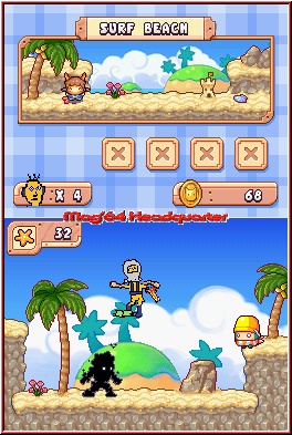 Alle Levels erreicht man übrigens über die Dorfkarte und die dort befindlichen Tore, die erst im Laufe der Spielzeit zugänglich werden. Bevor Ihr allerdings in die Jump'n Run-Welt abtaucht, gilt es ein paar Aufgaben für die Dorfbewohner zu erledigen. So müsst Ihr nach gewissen Raposas suchen, ihnen beim Ausmalen der farblosen Gebäude helfen, Blumen zeichnerisch gestalten und im Beet setzen oder die dunklen Schatten per Stylus entfernen. Letztendlich beschränkt sich der Großteil jener Aufgaben aber auf das Hin- und Herlaufen über die zusehends größer werdende Dorfumgebung. Betrachtet man den Titel unter allen heranzuziehenden Aspekten, kann man sagen, dass sich hier weitaus mehr positive Gesichtspunkte nebeneinander versammeln, als welche, die zu bemängeln wären. Nicht nur das bloße "Durch-die-Gegend-springen" begegnet Euch im Spiel, auch Raumschiffe besteigt der gesandte Schöpfer-Bote (selbstverständlich habt Ihr auch dieses zuvor ausgemalt!), U-Boote bringen Euch durchs kalte Nass. Lifte befördern Euch in rasantem Tempo durch die Gegend, nicht zu verachten sind auch die verschiedenen Fähigkeiten Eures Charakters: eine Zeitlang darf er sogar über dem Boden der Tatsachen schweben, später setzt er eine eigens gestaltete Tauchermaske auf und sucht sein Glück in den Untiefen der Gräben.