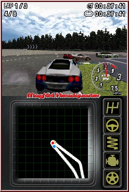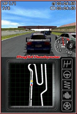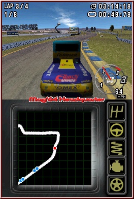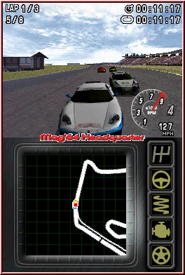 Gleich ist überall auch die Screenaufteilung. Während oben die fahrerische Action spielt, dient der Touch Screen als Karte, die ich als recht gelungen empfinde, und rechts anhand von Symbolen den Fahrzeug Zustand wiederspiegelt. DTM RD3 ist eines der wenigen Spiele, die ein Schadensmodell mitbringen. Für alle wichtigen Teile gibt es diese Symbole, die sich je nach Zustand verfärben. Rumpelt Ihr zu sehr an den Banden entlang, kracht andauernd in Gegner hinein oder laßt euch in kleine Scharmützel verwickeln leidet der Wagen. Das geht dann soweit das Ihr nicht mehr den normalen Top Speed erreicht, oder die Lenkung nicht mehr korrekt funktioniert. Alternativ habt Ihr dann einen Boxenstopp zur Verfügung und könnt dort den Wagen repairieren lassen. In Sachen Steuerung könnt Ihr neben der Handaufteilung auch wählen ob Ihr Gas und Bremse via Schultertasten oder A und B nutzen wollt. Per Kreuz oben und unten könnt Ihr das ganze dann auch mit manueller Schaltung fahren. Kümmern wir uns mal um die Steuerung selber. Hier gibt es Lob und Kritik. Lob dafür das sich wirklich jeder Wagen im Spiel anders fährt. Es gibt kaum ein Schema A an das man sich gewöhnen kann. Kritik weil sich manche Typen auch sehr zäh lenken lassen. Die guten Beispiele sind z.b. die DTM Fahrzeuge, die recht weich und exakt einlenken, während z.b. die amerikanischen V8 träge und mäßig lenkbar sind. Größtes Problem dabei ist das jeweilige Streckenlayout und die Kurven. Selten das man solange in einem Racer braucht um das System der Wagen halbwegs zu meistern. Größtes Problem bei der Mehrzahl der Fahrzeuge sind dabei die Bremsen. Zum einen ist das Bremsen an sich hörbar ganz schlecht umgesetzt. Auch kann man kein allgemeines Kriterium dafür finden wann sie greifen. Mit manchen Fahrzeugen rutscht man unweigerlich zu weit, andere reagieren schneller auf die Bremsvorgänge. Wieder ist die DTM hier das beste Beispiel. Dafür stimmt zumindest zum Teil der Simgedanke. Auf der Bremse einlenken funktioniert bei schnellen und mittelschnellen Kurven, während Haarnadel Varianten auch das Pumpen erlauben. Aber im gesamten eher nachteilig gelungen und im oft Spiel eher ein Problemkind, mit dem lange Zeit zu tun hat sich daran zu gewöhnen.