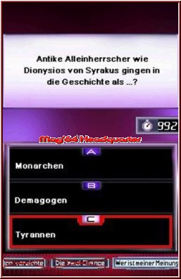 Außerdem stehen Euch drei Joker zur Verfügung, die allesamt mithilfe des Touchpens verwendet werden können. Jeder Joker zieht eine verschiedenartige Wirkung nach sich. So ist „Joker 1" eine geschenkte Antwort, die sich vor allem dann eignet, wenn Ihr absolut keine Ahnung habt. Allerdings bleibt Euch keine Wahl. Ihr müsst Euch von „Joker 1" bis hin zu „Joker 3" durcharbeiten. Mit dem dritten loszulegen, ist somit nicht erlaubt. „Joker 2" sagt aus, dass eine zweite Möglichkeit zur Verfügung steht, sollte die erste Antwortauswahl sich als Fehler erweisen. Beim „Joker 3" könnt Ihr hingegen feststellen, wer von den im Kandidatenfeld Sitzenden dieselbe Meinung hat wie Ihr. Je nachdem, ob die ausgewählte Antwort ein ausreichend großes Kandidatenfeld hinter sich herzieht, könnt Ihr diese einloggen oder doch nochmals etwas genauer überlegen.