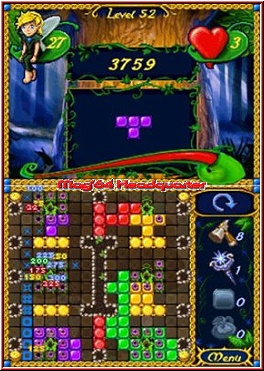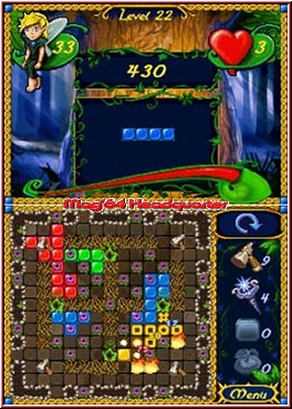 Erst nachdem alle Feenwesen befreit wurden, gilt ein Level als erfolgreich gemeistert. Bei 92 Aufgaben habt Ihr es mit einer stattlichen Anzahl zu tun, die Euch spätestens nach der ersten Hälfte vor teils große Hindernisse setzen dürfte. Generell sei aber gesagt, dass sich der Titel an all diejenigen richtet, die Puzzle-Spielen nicht abgeneigt sind. Wenn schon die Zaubersteine in deutlicher Absicht an „Tetris" erinnern, ist klar, dass das Spielprinzip das Köpfchen fordern wird – was es dann letzten Endes auch tut! Auf dem Topscreen erkennt Ihr die verbleibende Anzahl an Elfen, eine Zeitleiste informiert Euch über die verbleibenden Restsekunden: Je schneller Euch die Lösung des Spielfeldes gelingt, desto mehr Bonuspunkte dürft Ihr auf Eurem Konto gutschreiben. Selbstverständlich besteht auch die Möglichkeit, dass Euch die Zeit davonläuft und Ihr den gesamten Level ein weiteres Mal angehen müsst. Seid Ihr fleißig und vorbildlich im Einkassieren von Punkten, erwartet Euch mit 50.000 Zählern ein Extraleben – das aber genau so schnell wieder flöten geht: beispielsweise dann, wenn keine Zaubersteine mehr auf dem Spielbrett Platz finden. Wenn das bereits alles gewesen wäre, hätte der Titel mit Sicherheit nicht denjenigen Stellenwert bei uns, den er sich ergattern konnte. Denn dank viererlei verschiedener Extras geht es während der Knobelei heiß her: Mit dem „Magischen Stab" dürft Ihr benachbarte Zaubersteine derselben Farbe im Nu verschwinden lassen, wohingegen der Regenbogenstein als sprichwörtlicher Joker im Reigen der verschiedenfarbigen Blöcke angewendet werden kann. Mithilfe des Farbkelches vergrößert Ihr die Farbgruppe eines bestimmten Zaubersteines, der Hammer löst Steine nach Belieben auf. Dies ist dann von Vorteil, wenn das Spielfeld keine weiteren Züge mehr offen lässt. Durch Gehölz und Orakelsteine wird das Brett blockiert, allerdings könnt Ihr durch geschickte Herangehensweise auch diese Hindernisse mit taktischen Mittelchen umgehen und teilweise gar zerstören. Selbst Bomben lassen sich durch Zaubersteine aktivieren, die bei Detonationen das umliegende Gebiet von Objekten „erlösen". Wegen des äußerst kniffligen Spielprinzips, den zahlreichen Missionen und des taktischen Vorgehens, bringt „Elvenland" deutliches Suchtpotenzial mit sich, das in dieser Form bei uns gern gesehen ist – auch wenn der technische Aspekt heutzutage einem Schlag ins Gesicht entspricht!