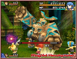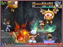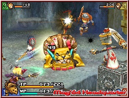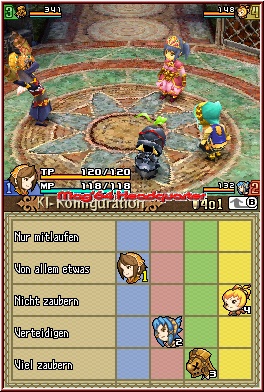 Immer schön wenn man so sieht was z.b. eine neue Waffe rein an TP beim Gegner abzieht. Erledigte Gegner zerbröseln vor euch und bringen euch neben Erfahrungspunkten für das obligatorische Aufleveln auch reichlich Items und Geld zum Einsammeln. So langsam kommen nun die einzelnen Menupunkte auf dem Touch Screen zu ihrem Recht. Dabei ist der Touch Screen nun mit vielen Anzeigen und Untermenus gespickt, wobei viele erst im Verlauf richtig wichtig werden. Die Grundeinteilung während des Spiels ist dabei das der oder die eigenen Charaktere links dargestellt werden. Dazu als Anzeige noch mal die Charaktere, die man so auch einzeln antippen und „Organisieren„ kann. In der Mitte hat man Zugriff auf die große Karte und das Inventory samt Ausrüstungsbildschirmen per Starttaste. Auf der rechten Seite findet man nun weitere wichtige Anzeigen. Diese betreffen die Klassen und Heilkristalle und ziehen ihre Energie aus der oben angebrachten Special Leiste. Hier spielt nun das Thema Magie mit hinein. Denn das gesamte Magie System, das hier alle Charaktere beherrschen ist angenehm übersichtlich gestaltet und erfordert keinen Abschluss auf der Magieschule. ;-) Ein paar einfache Beispiele soll euch das vermitteln. Die einzelnen farbigen Kristalle rechts entsprechen neben der Wiederbelebungsvariante den bekannten Elementen wie Feuer, Eis, Erde oder Blitz. Tippt man nun z.b. per Pen den roten Kristall an, so wird der gewählt farblich unterlegt und aktiviert. Im Spiel selber bedeutet das nun das Ihr die X-Taste gedrückt halten könnt. Jetzt erscheint ein Fadenkreuz das Ihr frei bewegen könnt. Habt Ihr es am gewünschten Ort platziert, was ein Gegner oder auch ein Objekt sein kann, lässt man die X-Taste los und löst einen Feuerzauber aus. Limitiert seid Ihr hier nun durch die Special Leiste. Unendlich kann man diese also nicht benutzen. Allerdings lassen z.b. viele Gegner genau diese fallen und man kann immer wieder Nachschub einsammeln. Genauso kann man also mit dem Heilzauber aus der Kristall Variante per Fadenkreuz mitten im Kampf einen oder mehrere Mitspieler anvisieren und so Heilen. Das kann also jeder. Drückt man nun einmal die Starttaste, gelangt man zum Inventory des aktiven Charakters. Hier findet man innerhalb des Punktes Status neben RPG typischen Stats wie Level und den Werten für Angriff und Verteidigung auch weitere verschiedene Unterpunkte.