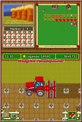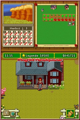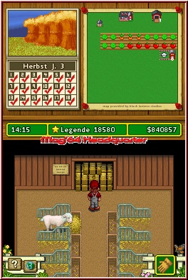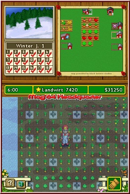 Sobald Ihr einen neuen Hof gründen wollt, dürft Ihr diesem zunächst einem Namen geben. Danach werdet Ihr von einem Hofberater begrüßt, der euch von nun an mit Rat und Tat zur Seite steht. Bei ihm könnt Ihr im Pausenmenu z.b. alle Tutorials noch einmal anschauen, oder auch die Tastenbelegung von Rechts auf Linkshänder stellen. Auch wenn das Spiel viel mit Touch Screen Aktionen arbeitet und euch diese meist bevorzugt vorstellt, ist auch die oft bessere Kreuz/Tasten Steuerung sehr gut enthalten und implementiert. Wie so oft ist die Mischung aus beiden Varianten das Beste in einem solchen Spiel. Habt Ihr diese einführenden Informationen geklärt zeigt Farm Life zunächst reichlich Parallelen zu einem Harvest Moon. Das beginnt schon mal bei der Screen Aufteilung. Während sich alles möglich an Gameplay direkt auf dem Touch Screen abspielt, dient der Top Screen für alle möglichen Infos, die man später über einen gut gemachten Info Modus noch detaillierter nutzen kann. Ebenso wie bei der Konkurrenz ist die Sichtweise in der Iso Sicht schräg über dem Geschehen. Ihr steuert so euren Farmer mit dem Kreuz und könnt mittels der L-Taste langsam Laufen oder auch schnell Rennen, was nicht zu unterschätzen ist auf Dauer. Auch die Rahmenbedingungen erinnern zunächst extrem an Harvest Moon. Ihr habt neben eurem Wohnhaus ein kleines Stückchen unbebautes Land und könnt eure Farm in Richtung einer Stadt mit diversen Geschäften verlassen. Gespielt wird hier ebenfalls nach einem Zeitsystem, das aber nicht in Echtzeit funktioniert. Übergeordnet spielt Ihr immer 4 Jahreszeiten eines Jahres und beginnt danach das jeweils nächste Jahr, ohne das es ein Ende gibt. Eine Jahreszeit hat 18 Tage, die mit je knapp 8 Minuten vergleichbar schnell vergehen wie bei der Konkurrenz.