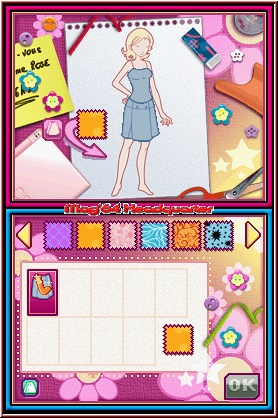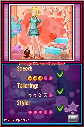 Das eigentliche Kernstück des Titels ist dann aber das Anfertigen der sündhaft teuren Kleidungseinzelstücke. Fünf Handwerksschritte gibt es zu beachten, nicht immer sind alle notwendig, um ein Objekt erfolgreich zu schneidern. Dennoch solltet Ihr überall Bescheid wissen, was Ihr bei welchen Bildschirmsymbolen zu beachten habt. Essentiell wichtig ist der Umgang mit der Stoffschere, da hieraus die eigentlichen Monturen entstehen – wenigstens in Grobform. Mit dem Stylus fahrt Ihr entlang gepunkteter Linien. Daneben schneiden solltet Ihr allerdings nicht, da Ihr hierdurch einen Fehler notiert bekommt, der wiederum für das Endergebnis negative Auswirkungen haben kann. Erscheint ein Handsymbol auf dem zu bearbeitenden Stoff, müsst Ihr dieses mit dem Touchpen falten, um es kurz darauf mit dem Bügeleisen zu glätten. Jedoch ist der Umgang mit einem elektronischen Handwerkszeug ein sprichwörtlich „heißes Eisen" – zu lange auf ein- und derselben Stelle verweilt, habt Ihr sofort ein Löchlein in den edlen Stoff gebrannt, das nur mit der Hand entfernt werden kann. Nähte erstellen erfolgt mit der Nähmaschine – im Grunde funktioniert diese genau so wie die Schere, freilich ist der Zweck ein anderer, denn Stoffteile werden damit ebenso zusammengenäht. Mit Nadel und Faden setzt Ihr zu guter Letzt Knöpfe an das zu bearbeitende Stoffstück. Achtet hierbei auf die Pfeilrichtungen, die auf dem Touchscreen angezeigt werden. Im Nu seid Ihr mit Eurer Kreation fertig! Übrigens lauert Euch immer eine Zeitleiste im Rücken, die jedoch nie zur akuten Gefahr wird, da man in der Regel mit der Aufgabenstellung ganz gut zu Recht kommt.