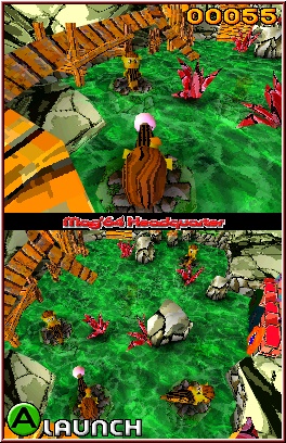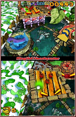 So beginnt das ganze mit einem Blick via Touch Screen auf einen Teil des Marktplatzes der Stadt, während der Top Screen die angrenzenden Berge zeigt, aus denen die Kugel nun losrollt. Jetzt gibt es immer 2 Möglichkeiten wie man das Spiel angehen kann. Zum einen kann man die Kugel rollen lassen und via Flipper im Touch Screen so durch die Gegend schnipsen wie es für ein Flipper eben üblich ist. Zweite Variante ist das Berühren eines Charakters oder speziellen Punktes, der etwas auslöst und euch auch in kleine Sequenzen eintauchen läßt. Wiegesagt spielt Text hier eine große Rolle, was Dank deutscher Sprache auch für jüngere Spieler also kein Problem darstellt. Dabei ist eine weitere Besonderheit des Spiels nun nicht nur die räumliche Darstellung, sondern die Einteilung aller Orte in mehrere Bereiche. Einfach gesagt warten in den Orten so viele einzelne Flipper Tische, die einfach in einer Welt aneinanderhängen. Spielt man die Kugel also entsprechend, wechselt man auf den Nachbarbereich, an dessen Ende unterhalb immer wieder 2 Flipper warten. Wahlweise könnt Ihr diese mit den L und R-Tasten bedienen oder im Falle des linken Flippers mit dem Kreuz und für den rechten mit den Actiontasten. Ist auf jeden Fall problemlos gelöst und geht ohne Verkrampfung von der Hand. Der erste Eindruck ist zunächst etwas unübersichtlich, da bedingt durch die 3D und zudem kunterbunte Darstellung der Blick für das Wesentliche etwas abhanden kommt. Schickt man die Kugel allerdings ein paar mal durch die möglichen Bereiche, ändert sich das aber schon. Ist wiegesagt nur ein Starteffekt in vielen Locations, sofern man diese das erste mal erreicht. Anders als bei herkömmlichen Flippern findet man hier nun keine Objekte wie gewohnt um Punkte zu erzielen, sondern eben der Location angepaßte Dinge. In der Stadt kann man z.b. Vögel aufscheuchen oder Raketen berühren um Punkte zu erzielen. Man trifft einen Baum und dessen Früchte fallen herunter. Flippert man diese von der Fläche gibt es ebenfalls Punkte. Auch das wäre nun noch nicht so spannend. Der Kick im Gameplay ist die Zusammenarbeit mit der Umgebung, wo nun auch der Touch Pen seine Aufgabe erhält.