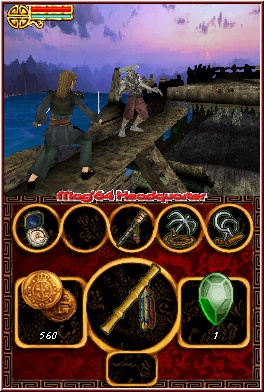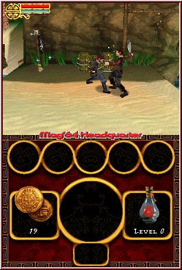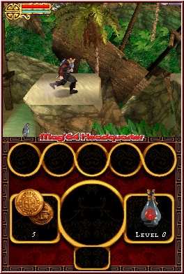 Im gesamten Spiel hindurch könnt Ihr verschiedene Dinge wie einen Dolch, Bomben oder Peitschen aufnehmen und legt dann jeweils das gerade aktive Item ab. Mittels R-Taste setzt Ihr die Sekundärwaffe ein, was jedesmal ein wenig Energie aus der blauen Leiste zieht. Mittels normaler Fechtaction füllt Ihr diese wieder schnell auf. Die Gegner werden mit jeder neuen Location immer schwerer, ohne euch aber vor unlösbare Aufgaben zu stellen. Hier greift wenn der Schwierigkeitsgrad Schwer erst richtig ein, oder aber Ihr werdet von mehreren Gegnern gleichzeitig attackiert. Gegner hinterlassen ebenfalls Dinge wie Geld oder Items um die Lebenseiste zu füllen. Von dem her spielt sich das Game wie der Vorgänger und flüssige und unterhaltsame Fechtaction erwartet euch. Die Abwechslung und Neuheiten definieren sich aus 2 anderen Dingen. Zum einen durch die 5 Itemplätze im Inventory des Touch Screens und durch die speziellen Duell Momente, gegen die sogenannten Boss Gegner. Die Itemplätze sind nichts als Platzhalter für Fähigkeiten Upgrades. Einmal erhalten zieht man das gewünschte der 5 in den mittleren großen Kreis und kann das ganze nun mittels A-Taste jederzeit oder nur zu bestimmten Momenten nutzen. Beispiel für jederzeit ist der Kompaß, der euch per Pfeil versteckte Schätze anzeigt. Auf der anderen Seite z.b. der Bambusstock. An speziellen Stellen kann man diesen Nutzen um Schluchten und größere Abgründe zu überwinden. Sie sind wiegesagt der Hauptgrund um schonmal gespielte Locations nochmal zu besuchen, da man sie erst mit der Zeit alle besitzt. Zweiter Punkt sind die Duelle, die abseits der normalen Metzelaction immer ein 1-1 Spielchen darstellen. Eine andere Darstellungsweise schräg von hinten und ein veränderter Top Screen ist hier ebenfalls dabei. Denn im Unterschied zur normalen Action spielt sich das ganze hier im Touch Screen ab. Was auch seinen Grund hat, da man diese Duelle rein mit dem Touch Screen steuert. So könnt Ihr hier praktisch mit Wischbewegungen Schwertangriffe ausführen. Zu Beginn des Spiels könnt Ihr nur wenige, sprich hier einfach nur links oder rechts und natürlich die oben/unten Variante. Euer Charakter vollführt genau diese Aktionen um den Gegner zu treffen. Je weiter Ihr im Spiel voran kommt um so höher wird die Auswahl an Moves.