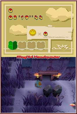Wie schon erwähnt ungewöhnlich ist die Tatsache das Ihr das eigentliche Spielgeschehen auf dem Touch Screen seht und dort agiert. Der Top Screen dient hier für diverse Anzeigen. Neben einer mitlaufenden Zeit existiert auch eine Score Anzeige, sowie eine Münzenanzeige mit denen Ihr später nützliche Dinge bekommen könnt. Eines davon ist die sicherlich positivste Neuerung gegenüber den schweren GBA Versionen. War dort nach nur einem Treffer oder Fehltritt Schluß, gibt es in der DS Version eine Lebensleiste. Ebenfalls im Top Screen untergebracht sind diese Energiebehälter in Form kleiner Froschköpfe umgesetzt. Jeder davon besteht aus 4 Zellen, sprich Trefferpunkten. Stürzt Ihr also mal in's Wasser oder ein Gegner trifft oder berührt euch zieht man euch eine Zelle ab. Das man diese nun auch noch erweitern kann sorgt an vielen Stellen für eine wesentlich geringere Frustgefahr als früher. Zudem sind die Level von Rücksetzpunkten durchzogen. Zwar teilweise recht weit auseinander sorgen diese beiden Feature dennoch für ein flüssigeres Gameplay, wo man sich eben doch mal einen oder mehrere Fehler erlauben kann. Und die passieren unweigerlich. ;-) Was mich zur Sichtweise und der Steuerung bringt. Neben Frogger übernehmt Ihr auch Lumpy im Spielverlauf, wobei sich soviel dabei nicht ändert. Die Sichtweise ist wie in alten Teilen in der Iso Sicht von Oben gehalten und bietet in Sachen Übersicht so das beste Ergebnis. Das Grundlayout der Steuerung ist gleich und einfach Frogger typisch auch auf dem DS. Ihr könnt den kleinen Racker nämlich nur in 4 Richtungen bewegen. Per Steuerkreuz um 1 imaginäres Feld nach allen Seiten, mit der B-Taste um 2 Felder per Sprung und könnt ihn per L und R dabei auf der Stelle drehen. Denn steht Ihr z.b. auf einer einzelnen Plattform und schaut nach oben ist ein Drücken auf dem Kreuz nach links gleich mit einem Schritt nach links verbunden. Ist dort kein Feld stürzt Ihr ab. Die Steuerung selber ist sehr gelungen und bietet keinen Anlaß zur Kritik, wenn man sich einmal daran gewöhnt hat.