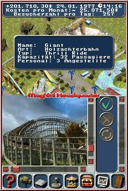 Habt Ihr bei „Theme Park" noch die einzelnen Besucher erkannt, wie sie beispielsweise kotzend vor dem Ausgang standen, weil der Magen aufgrund reichhaltigen Konsums von Cola und Zuckerwatte verklebt war, ist „Family Park Tycoon" ein relativ lebloser Vertreter seiner Zunft. Keinen einzigen Parkbesucher sieht man hier, alles was zählt, sind „Fakten, Fakten, Fakten"! Über eine Anzeige erkennt Ihr wie viele Besucher derzeit durch das Gelände wuseln, wie hoch Euer aktuelles Vermögen ist und welche Ausgaben Monat für Monat auf dem Programm stehen. Alles Dinge, die Ihr bei Euren Investitionen berücksichtigen müsst, um nicht vorschnell pleite zu gehen. Wie wäre es anfangs also mit einer Pommes-Bude, einem Cola-Stand sowie einem Hamburger-Verkauf? Allesamt Einrichtungen, die sich gegenseitig bedingen und in einem Freizeitpark sinnvoll erscheinen. Problematisch hingegen: Alle Attraktionen des Spieles kommen ohne wirkliche Beschreibung daher, sondern nur als liebloses Bildchen, das kaum Eindruck vermittelt. Was man sich hierbei gedacht hat, lässt sich nur erahnen. Viel dürfte es auf jeden Fall nicht gewesen sein. Mit dem Startkapital gönnt Ihr Euch eine Achterbahn – verschiedene Ausführungen stehen zur Verfügung, aber wie gesagt: die Unterschiede sind nur marginal, denn eine Detailbeschreibung fehlt bedauerlicherweise. Thematisierte Indoorbahnen, Wasserbahnen oder Fahrgeschäfte wie Riesenräder, Hochfahrgeschäfte oder Karussells gibt es ebenfalls käuflich zu erwerben. Gemeinsam haben diese alle, dass sie ungemein teuer in der Anschaffung sind und hohe Betriebskosten veranschlagen. Denn beinahe eine jede Attraktion fordert zumindest einen Verkäufer – weiterhin Einweiser, Operatoren und Techniker, falls die Technik mal zu wünschen übrig lässt. In Zukunft habt Ihr Euch also auch mit Gehaltsforderungen der Angestellten auseinanderzusetzen. Unspektakulär verläuft das Errichten einer Attraktion: Ein Klick genügt und schwupps steht die „Geschichte". Die Zuteilung der Beschäftigten nicht vergessen und schon kann es losgehen.