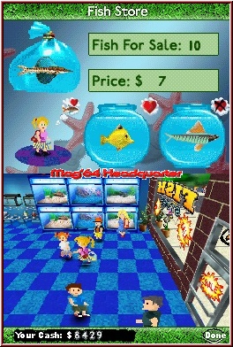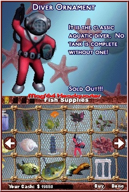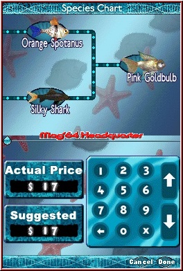 Fischbedarf gibt es käuflich zu erwerben, wobei gegen akute Krankheiten ebenso Mittelchen vertreten sind, wie Wachstumsbeschleuniger, die lange Wartephasen geschickt überspringen, jedoch aber nicht ganz billig sind. Temperaturregler und Belüftungssystem gehören zum Standard, Schnecken und Seepferdchen sorgen dafür, dass es der Fischzucht „seelisch" besser geht. Solltet Ihr nicht der natürlichen Vermehrung zugetan sein, tun es auch Fischeier, die, je nach Preis, seltene Arten zu Tage befördern. Logisch, dass diese dann auch für mehr Geld im Portemonnaie sorgen. Diverse Pflanzen sorgen für Fruchtbarkeit und erhöhte Überlebenschancen, Beckeninterieur wie Schiffswracks oder antike Säulen für einen optischen Blickfang, der auch den Fischen als Ort der Behausung gut gefallen dürfte. Durch Forschung verbessert Ihr die Lebensbedingungen im Becken und helft durch Marketingstrategien, dass Euer Geschäft stadtbekannt wird. Um an das dafür benötigte Geld zu kommen, bedarf es eines geschickten Verkäufers, der seine Arten namentlich zu bestimmen weiß und ein Händen für die Preiskalkulation hat, wobei Euch die Software hierzu Vorschläge unterbreitet. Über das Menü gelangt Ihr in den Laden, der von unzähligen Kunden frequentiert wird. Allerdings sind diese nur dann bereit etwas zu kaufen, wenn die Qualität und der Preis stimmen. Dies erkennt Ihr anhand kleiner Symbole oberhalb des Kunden. Hat er den Fisch seiner Wahl gefunden, schlägt er zu. Selbst müsst Ihr dazu nichts beisteuern, denn der Verkauf funktioniert vollkommen automatisch. Jedoch ist es relativ zeitaufwendig Geld zu verdienen, da die Fische gewöhnlich nicht viel einbringen und nur etwas über die Menge zu machen ist. Auf der anderen Seite stehen die hohen Verkaufspreise für zuvor genannten Fischbedarf, der nach und nach zwangsläufig benötigt wird.