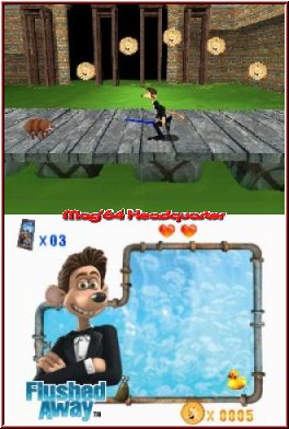 Zwei Charaktere steuert Ihr in "Flutsch und weg". Roddy, den unverschämt wohlhabenden Mäuserich, sowie Rita, die schlitzohrige Mäusedame. Selbstverständlich unterscheiden sich die zwei in ihren dargebotenen Fähigkeiten: Roddy ist ein wahrer Schwertkämpfer. Wie in Raserei versetzt stürmt er beim Stoßangriff Richtung Feind, respektive Mauer, um während der hinterher geschalteten Angriffsrolle alles vor ihm Liegende auszuschalten. Rita hingegen liebt es mit ihrem Bungee-Seil durch die Umgebungen zu schwingen. An speziell gekennzeichneten Plätzen aktiviert Ihr das Seil und überquert so leichthändig jeden gefährlich wirkenden Untergrund. Ebenso darf sie das Seil dazu benutzen, den Feinden den Boden unter den Füßen zu entreißen. Ansonsten gleichen sich die Fähigkeiten der beiden Protagonisten. Normale Sprünge sind für flinke Mäuse selbstverständlich. Auch ein Doppelsprung liegt im Repertoire der beiden. So erreichen sie jede Anhöhe mit Links. Zusätzlich erlauben die Standardangriffe gezielte Attacken auf die hirnlosen Feinde. Ein Tritt von Rita betäubt Euer Gegenüber im Nu, Roddy läuft mutig-entschlossen mit einem Plastikschwert in den Kampf.