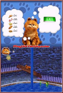 Vor jedem Level gibt es einen kurzen einleitenden Text zur Umgebung, oder zum Benutzen der speziellen Features wie dem Mikro oder dem Touch Screen. Grundlage des Gameplays ist aber normale Plattform Hüpferei. Nach kleinen Ladezeiten startet das Level und Ihr seht Garfield in einer Third Person Ansicht. Dabei könnte man im ersten Moment denken euch erwartet ein Jumper in frei begebaren 3D Umgebungen. Stimmt so nicht ganz und nach ein paar kurzen Bewegungen per Kreuz zeigt sich das Ihr in den Leveln feste Wege innerhalb der 3D Darstellung gehen könnt. Schaut man von der Seite auf Garfield und drückt links auf dem Steuerkreuz, so läuft er auch nach links. Kommt man z.b. an eine Häuseecke, drückt man weiter links und Garfiled läuft um diese Ecke. Dabei dreht nun praktisch nur die Kamera mit, die fest eingestellt Garfield so immer mittig im Screen zeigt. Ähnelt ein wenig dem Fluch der Karibik 2 Game auf dem DS. Die Grundsteuerung geht nun an sich in traditioneller Form per Kreuz und Tasten vonstatten. Neben den Richtungen steht euch zunächst nur die A-Taste für den Sprung zur Verfügung. Hier gibt es aber ein großes Lob. Das Sprungtiming ist den Entwicklern sehr gut gelungen, auch wenn es anfangs ungewohnt erscheint. Denn die Drucklänge auf den A-Knopf samt Kreuz Einsatz definiert die Weite und die Sprungkurve, die Ihr mit Garfield auf dem Screen zaubert. Egal ob aus dem Stand oder beim Laufen, das ganze ist mit der Zeit sehr genau und man gewöhnt sich an das weiche und etwas andere Sprungtiming sehr schnell. Gerade in der zweiten Hälfte des Spiels, wo punktgenaue Landungen erforderlich sind gut umgesetzt. In Sachen Screenaufteilung ist das Spiel so gestaltet das die eigentliche Action auf dem Touch Screen tobt, wo euch zudem die Anzahl der Leben angezeigt wird. Der Top Screen dient nun dazu Levelziele und die sammelbaren Objekte darzustellen. Neben Garfield samt Dödel Blick erscheint rechts in einer Gedankenblase das eigentliche Levelziel, nämlich der Ort den Ihr erreichen müßt um das Level zu beenden.