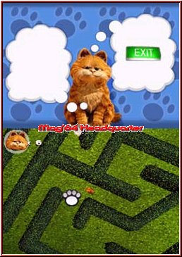 Garfield 2 ist dabei auf dem DS ein Action Jumper der etwas anderen Art. Zudem werden der Touch Screen und auch das Mikro mit in das Gameplay einbezogen. Zwar nicht in immensem Umfang bringen diese Zusätze aber hier und da Abwechslung in das Gameplay. Im gesamten besteht das Spiel dabei aus knapp 25 Leveln, die sich aber in 2 Kategorien unterteilen. Neben den reinen Action Leveln gibt es in regelmäßigen Abschnitten kurze Kapitelstart Level um die wir uns gleich kümmern. Dabei spielt Ihr alle Level in einer festen Reihenfolge und schaltet nach Beenden eines Levels das jeweils nächste frei. Da es in den Action Leveln Objekte zum Sammeln gibt, kann man diese jederzeit wiederholen. Schade das man das ganze nicht mit irgendwelchen Belohnungen verbunden hat um die Motivation zu steigern. So hält sich der Wiederspielwert im gesamten in Grenzen und beschränkt sich wenn auf das Zeitspiel über das Hauptmenu. Kümmern wir uns zuerst um die Level Einteilungen. Einfach gesagt werden zu bestimmten Abschnitten, wo Garfield eine neue Location betritt kurze Startlevel eingestreut, die in Sekunden gelöst sind. Hier ist die Sichtweise auf den Screen in Form seiner Augen gestaltet und Ihr müßt einfach nur den Weg finden um die neue Location zu betreten. Erreicht Ihr z.b. das Schloß steht Ihr praktisch vor dem verschlossenen Tor zum Schloßpark. Per Garfield Augen und Pen könnt Ihr euch nun in einer First Person Variante umschauen. Hier müßt Ihr einfach nur ein Loch im angrenzenden Zaun finden, kurz das Loch darin mittig platzieren und schwupps seid Ihr in der nächsten Location und dieses Level ist gelöst. Natürlich ist das nicht alles und wäre spielerisch auch ein wenig dünn. ;-) Das Gameplay selber wartet in den Action Leveln auf euch.